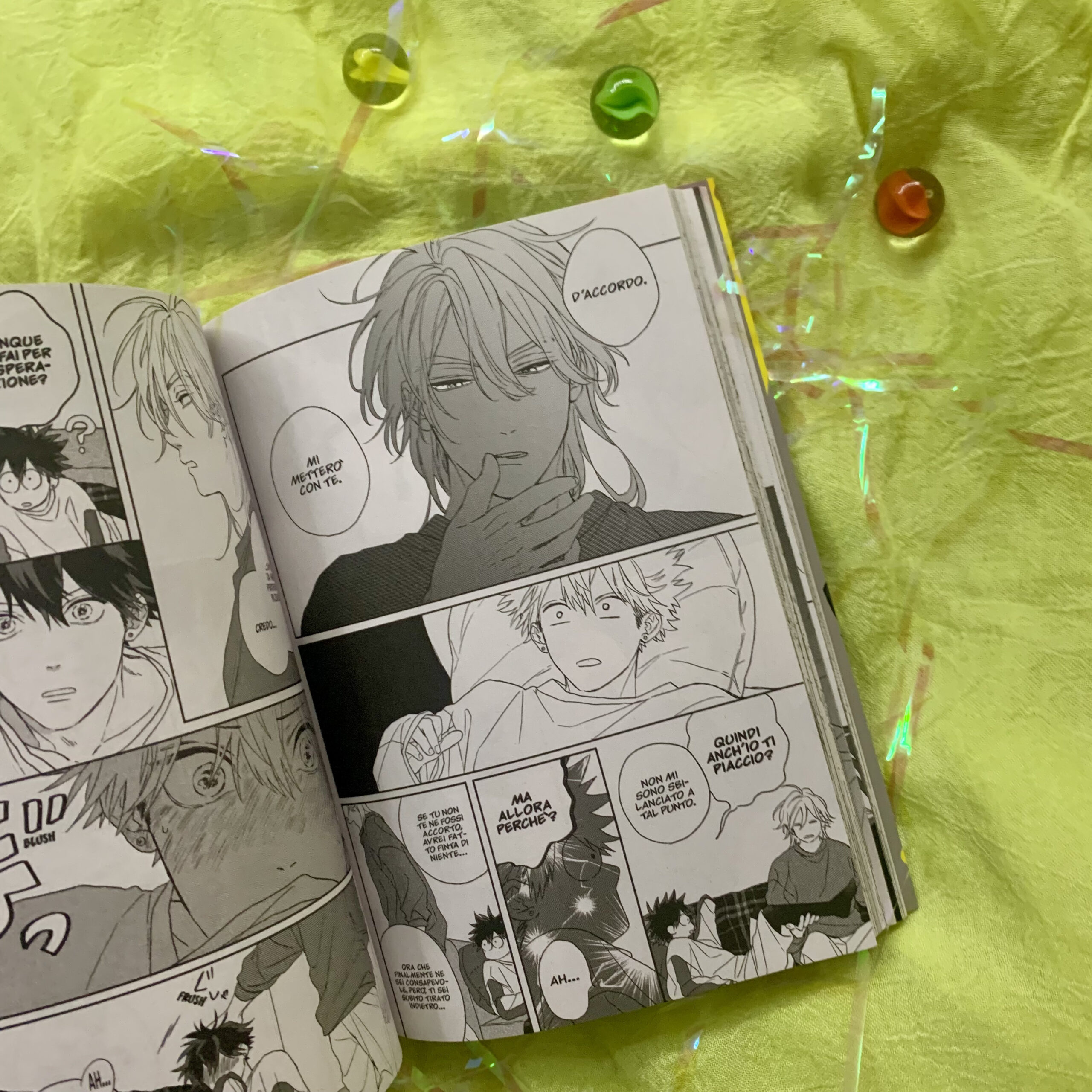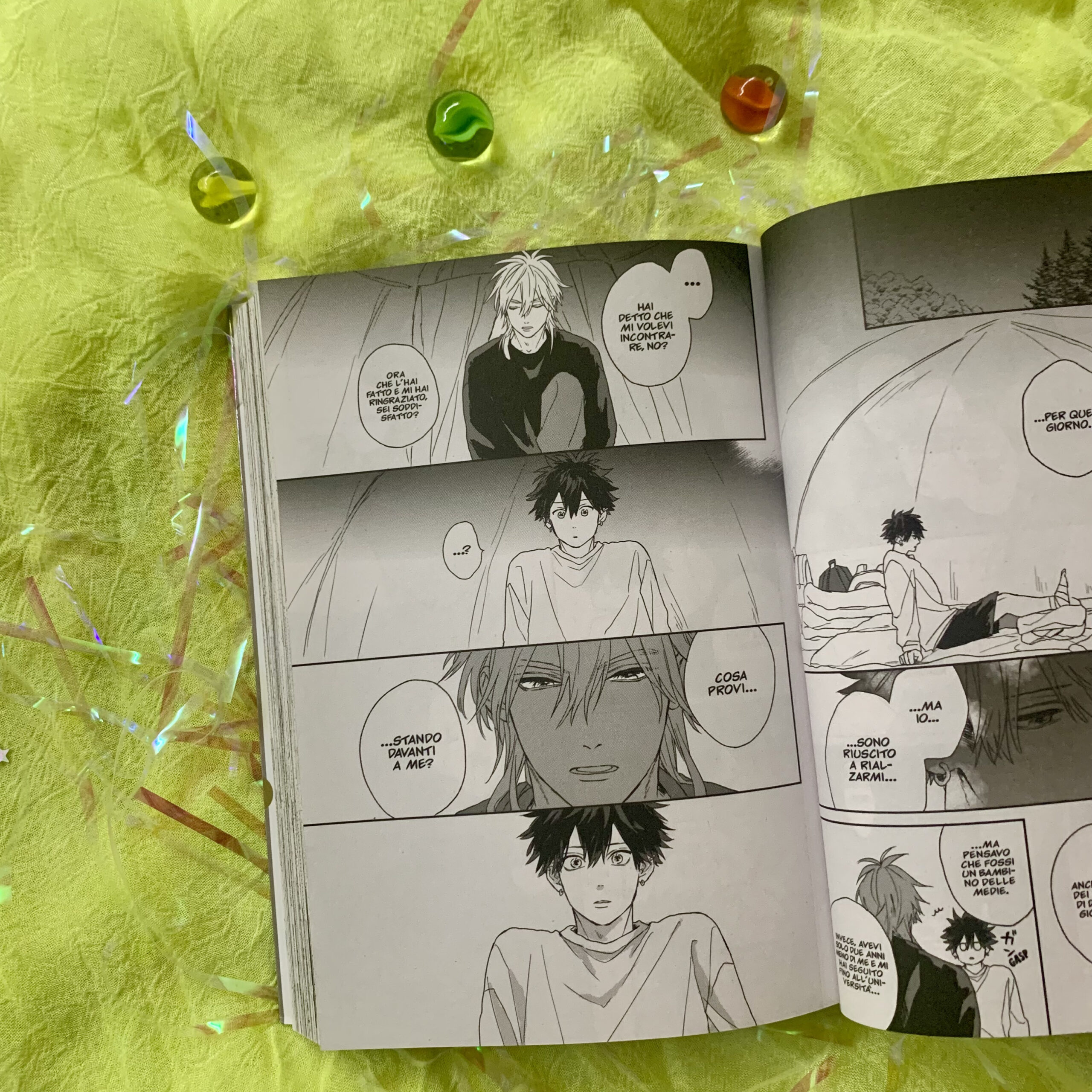 Il personaggio di Takara, in particolare, si svela nella seconda metà de Il tesoro di Takara dove dimostra il suo tenere alle cose, anche piccoli oggetti come le biglie brillanti, un ricordo del nonno che gli ha anche trasmesso la passione per le escursioni, per la natura, ma anche dare il “giusto” valore alle cose e alle persone. In questo modo si capisce il suo personaggio e capiamo anche il suo modo di tenere a Taishin, che si dimostra per lui un tesoro da proteggere pur lasciandolo libero di fare esperienze. Si vede infatti la dolcezza della quotidianità e della normalità della loro vita universitaria e non. La storia rimane infatti poco esplicita nel mostrare l’amore dei due protagonisti tranne per il capitolo extra che chiude il volume e che si focalizza proprio sulla prima volta di Takara e Taishin.