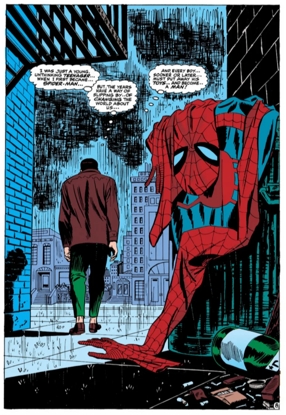 L’episodio 7 si conclude con Spider-Man che subisce il pungiglione dello Scorpione e, in fin di vita, spera che Osborn riesca ad inviare un prototipo di aliante per salvarsi. L’episodio 8 si apre con un omaggio alla classica pagina di John Romita Sr. nell’iconico Amazing Spider-Man #50 del 1967, che mostra uno scoraggiato Peter Parker che getta il suo costume da Uomo Ragno in una storia intitolata “Spider-Man No More”. (Peter riprende la sua carriera di combattente del crimine nella pagina finale di quello stesso numero).