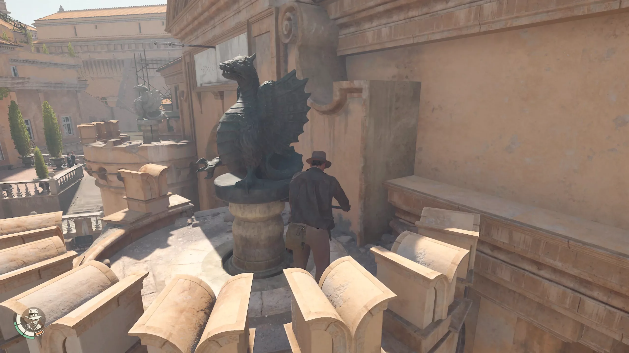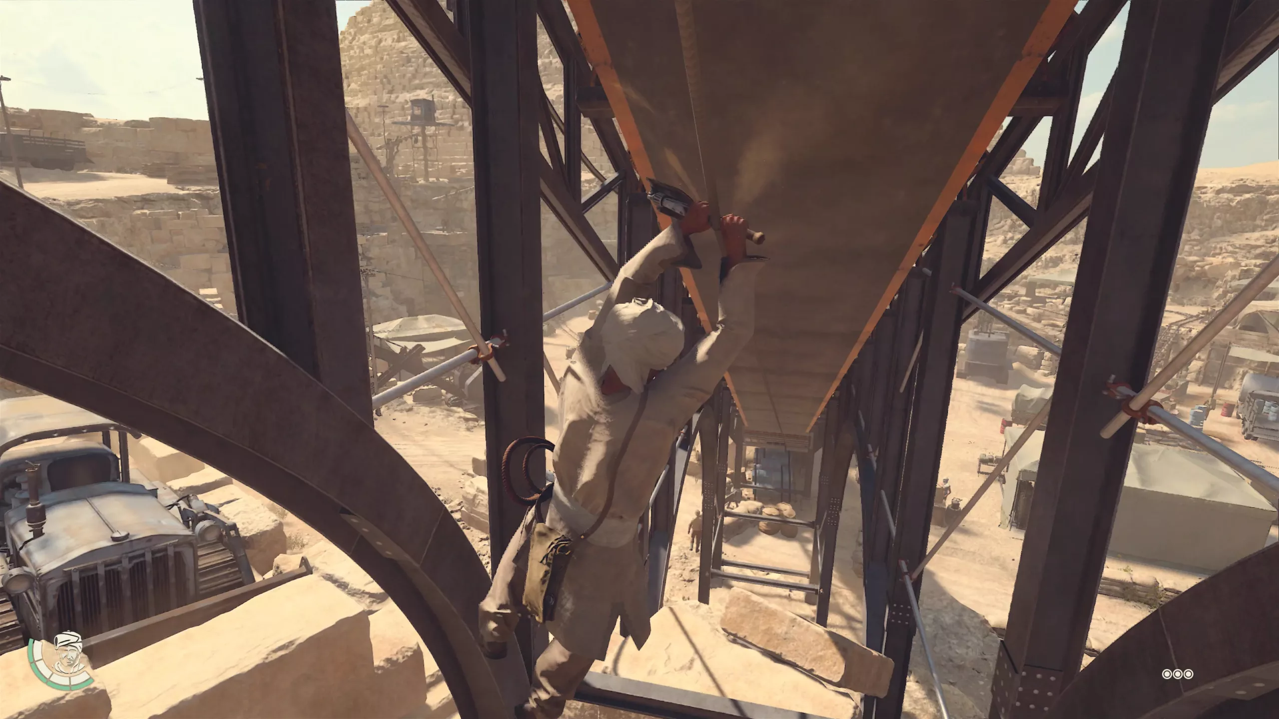 Si è molto discusso della tanto agognata visuale in prima persona del nuovo gioco di MachineGames, ma possiamo assicurarvi che mai scelta fu più azzeccata: il gameplay vi esorta ad esplorare le varie zone, a seconda delle quali vi permetteranno di ispezionare aree a corridoio (quindi con un percorso guidato che permette di avanzare in un’unica direzione per proseguire nella quest principale) oppure aree open map (zone un po’ più grandi con variazioni di percorso, che consentiranno di svelare ulteriori segreti, enigmi, documenti, e molto altro, al di fuori della quest principale). Nel corso della nostra avventura utilizzeremo molti strumenti, tra i quali l’iconica frusta di Indiana Jones, che ci permetterà di svolgere una moltitudine di funzioni tra le quali agganciarsi ad appigli per arrampicarsi o saltare un burrone, frustare i nemici in combattimento o distrarre i nemici provocando rumori.
