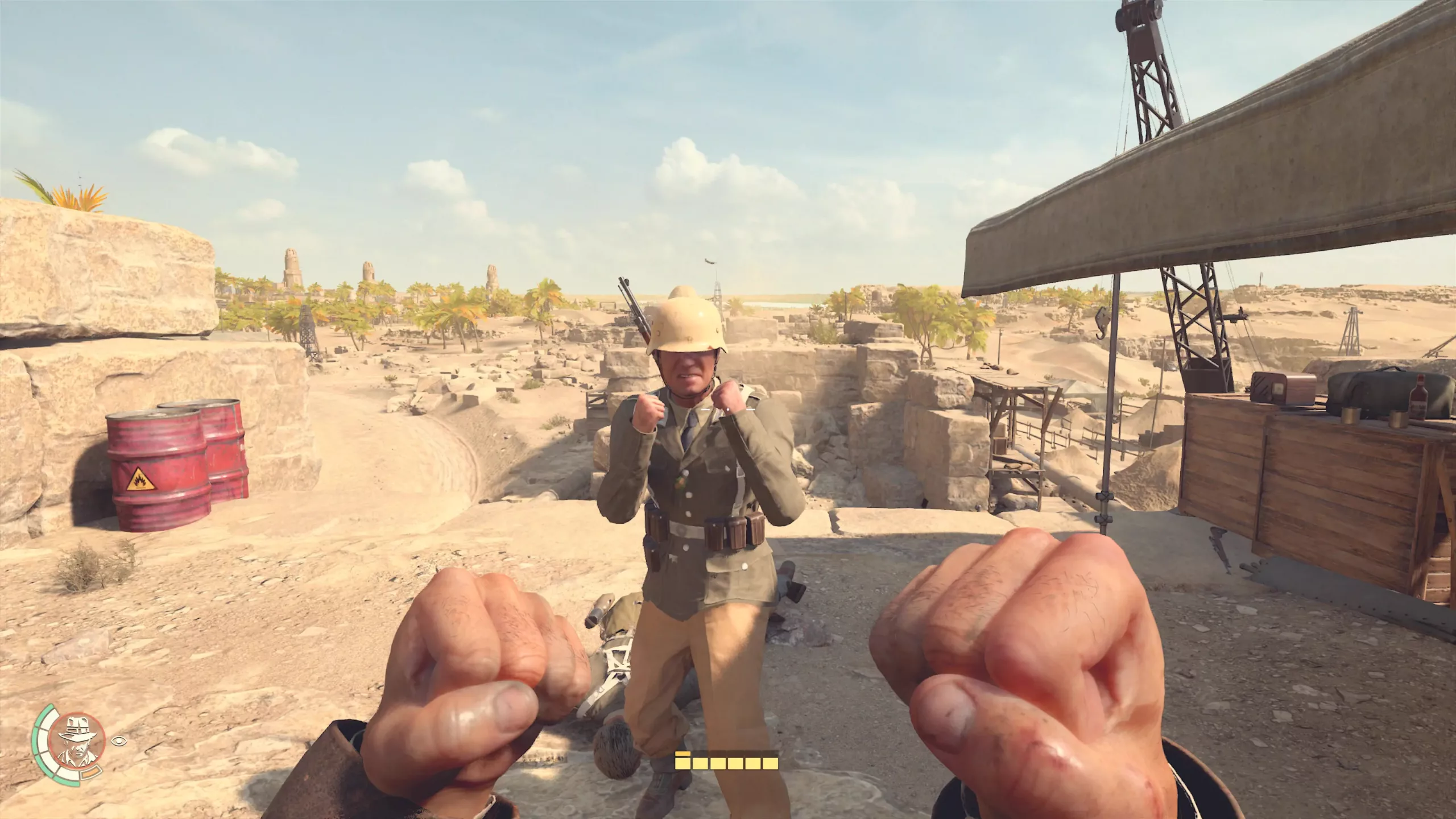 Molta attenzione è stata rivolta al combattimento a mani nude, con vari attacchi, parate e contrattacchi, oltre a poter raccogliere oggetti nello scenario che permetteranno di stordire il nemico in un batter d’occhio, lanciando o picchiando a suon di badilate (e non solo!). Il combattimento con le armi da fuoco (pistole, fucili) non è il focus dell’esperienza, infatti, è meno curato rispetto ai vari Wolfenstein, ma si è scelto un approccio più realistico e, proprio per questo quando si spara, si farà molto rumore attirando così parecchi nemici. Il gioco propone due metodi di approccio, ovvero lo stealth (con alcune vibes a Dishonored) e l’approccio diretto consentendo al giocatore di confrontarsi come meglio crede con lo scenario ed i nemici, sorprendendo i nemici da dietro le spalle stordendoli, oppure adottando le classiche scazzottate o sparatorie, o ancora evitando approcci nascondendosi nell’ambiente (anche tramite travestimenti). L’I.A nemica non è infallibile e, seppur i tempi di reazione dei nemici siano nella norma per un’avventura di questo tipo, ci si aspettava qualcosa in più.