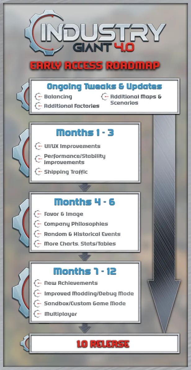 Con il lancio in Early Access, inizia la prossima fase di sviluppo di Industry Giant 4.0. Uno dei punti focali per lo studio sarà il riscontro della community. Con le basi del gameplay già ben definite e numerose industrie e quasi 80 beni producibili disponibili per gli aspiranti titani degli affari, il feedback dei giocatori sarà cruciale. Durante il periodo di Early Access, non solo verranno introdotti nuovi contenuti e ulteriori elementi o funzionalità di gameplay, ma anche le richieste della community saranno prese in considerazione.