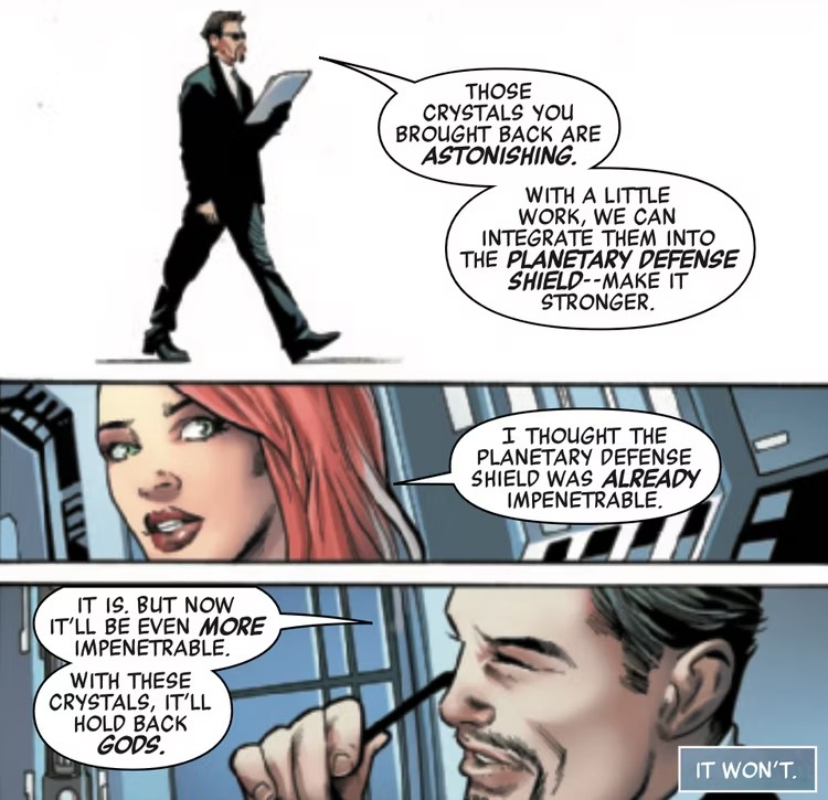 Al ritorno a Avengers Mountain, Tony mette le mani sui cristalli e inizia subito a giocarci. “Quei cristalli che hai portato sono sorprendenti”, commenta. “Con un po’ di lavoro, possiamo integrarli nello Scudo di Difesa Planetario e renderlo più forte”. Vedova Nera fa notare che lo Scudo di Difesa Planetario dovrebbe già essere impenetrabile; tuttavia, Tony ritiene che ci siano modi per migliorarlo. “Sarà ancora più impenetrabile”, dice. “Con questi cristalli, tratterrà gli dei”. Alla fine del numero si scopre che un essere divino sta per arrivare sulla Terra: un nuovo cattivo chiamato l’Emissario si inginocchia di fronte a una gigantesca figura corazzata, il che significa che il nuovo scudo di Tony potrebbe presto essere messo alla prova.