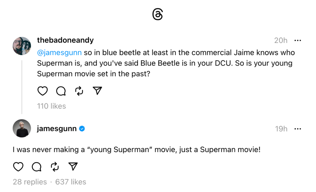L’universo DC si dirigerà verso una direzione interessante nei prossimi anni, con James Gunn e Peter Safran alla guida di una nuova serie di film e show televisivi esclusivi di Max. Si prevede che questo universo “reimpostato” includa una miscela di attori di recente nomina e interpretazioni già esistenti, cosa che ha suscitato molte domande sulla nuova continuity. Con la conferma che Jaime Reyes / Blue Beetle (Xolo Maridueña) di Blue Beetle passerà al nuovo DCU, e con il riferimento a un Superman nel film, un fan ha chiesto a Gunn sulla piattaforma di social media Threads che cosa significhi questo per il prossimo Superman: Legacy. Secondo il regista anche se la versione di Superman di Legacy è deliberatamente più giovane, non sta realizzando un film specificamente dedicato a un “giovane Superman”.