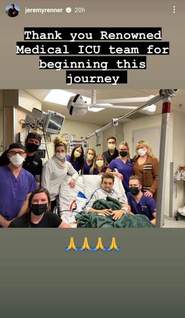 L’attore di Hawkeye, che ha compiuto 52 anni sabato 7 gennaio, ha condiviso una foto di sé in ospedale sulla sua storia di Instagram. Nella foto, Renner è circondato dal personale dell’ospedale e la didascalia contiene un messaggio di gratitudine. “Grazie al team della Renowned Medical ICU per aver iniziato questo viaggio“, ha scritto Renner.