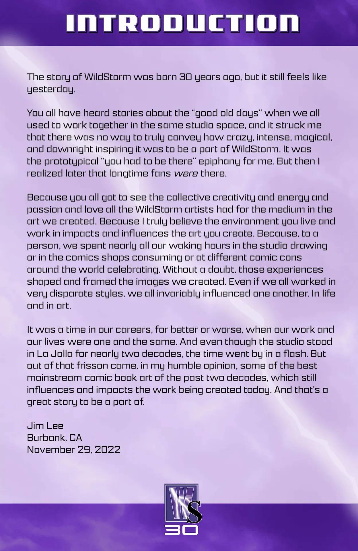 “La storia di WildStorm è nata 30 anni fa, ma sembra ancora ieri”, scrive Lee nella lettera, datata 29 novembre 2022. Tutti voi avete sentito storie sui “bei tempi andati”, quando lavoravamo tutti insieme nello stesso studio, e mi ha colpito il fatto che non c’era modo di trasmettere veramente quanto fosse folle, intenso, magico e decisamente stimolante far parte di WildStorm. Per me è stata la prototipica epifania del “dovevi esserci”. Ma poi ho capito che i fan di lunga data erano lì”.