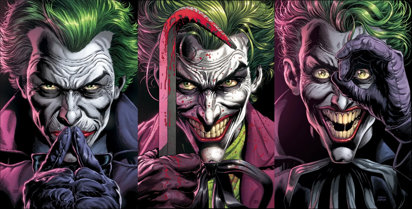 La storia immaginata da Geoff Johns e magistralmente illustrata da Fabok ha premesse e strutture leggermente più complesse della precedente: partendo da un elemento di Darkseid War in cui Batman acquisisce una sorta di onniscienza dovuta all’utilizzo della sedia di Moebius, il veicolo spazio-dimensionale del dio Metron, scopre che in realtà Joker non è mai stato “unico” ma che sono sempre esistiti tre distinti Joker. Da questa premessa si sviluppa i Tre Joker, storia in tre parti ognuna dedicata a un diverso Joker. L’idea di Johns è di creare una storia in cui le tre diverse identità del joker rispecchino in realtà altrettanti periodi editoriali, alternandosi: il Criminale, ossia il Joker degli albori fumettistici (la cosiddetta Golden age del fumetto americano), pragmatico e a tratti quasi filosofico nonché estremamente serioso; il Clown, cioè il joker più strampalato e comico (legato alla Silver age) e che sarebbe direttamente legato al ciclo di “una morte in famiglia”, in cui il secondo Robin, Jason Todd, viene ucciso proprio da Joker; il terzo e ultimo Joker, il Comico, è quello più spietato e psicopatico e rappresenta l’incarnazione moderna del personaggio, qui rappresentato non a caso proprio come il joker di Bolland, colpevole di aver sparato a Barbara Gordon in The Killing Joke. Da questa lunga premessa si articola una storia in cui Batman, Batgirl e Red Hood seguono un’indagine riguardante i tre Joker, ognuno di loro personalmente legato a ciascuno dei pagliacci.