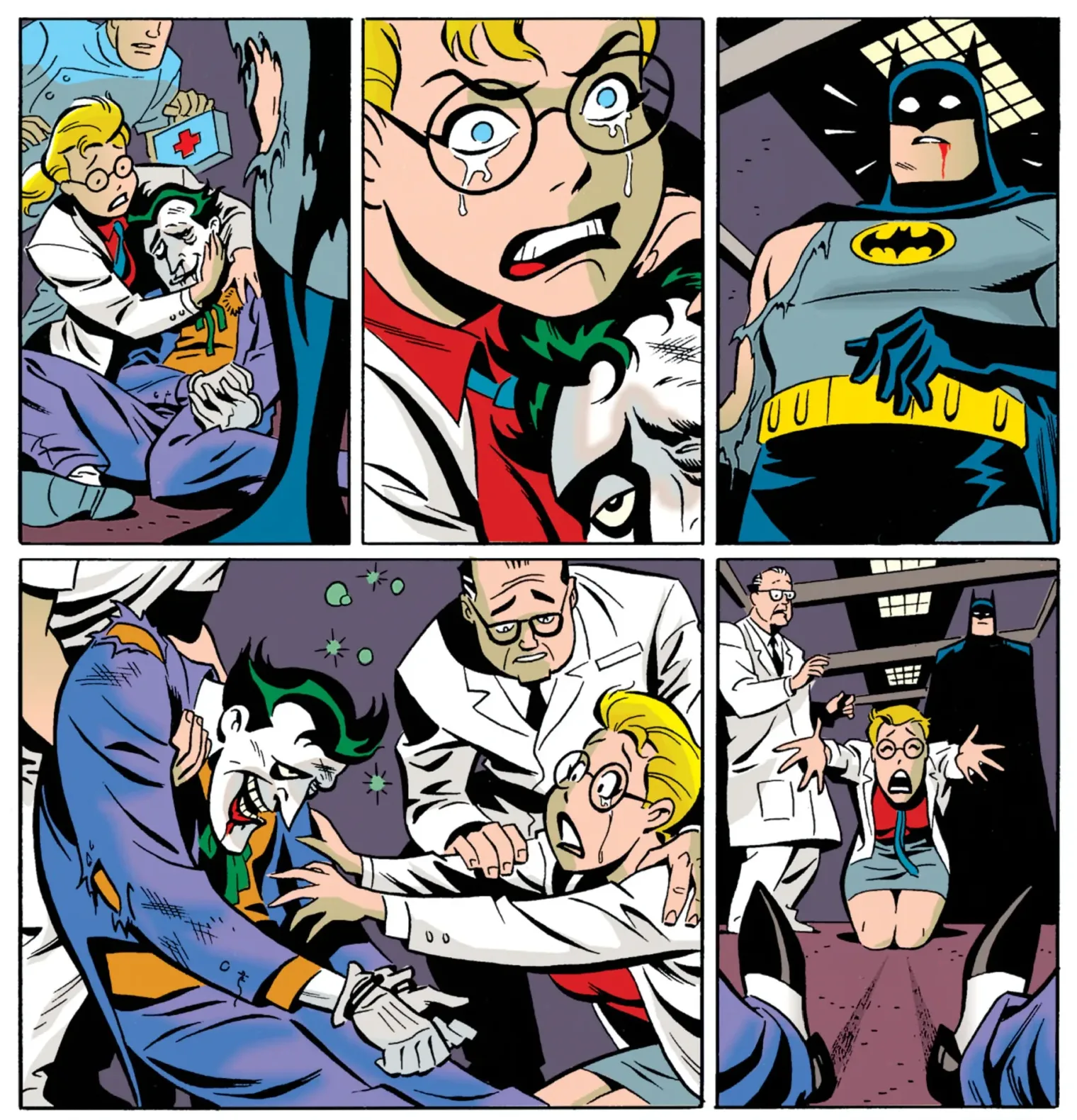 La storia che conclude il volume, Amore Folle, è una storia importante perché segna il debutto fumettistico di Harley Quinn: il personaggio, nato proprio nella serie animata (Paul Dini creò il personaggio ispirandosi all’attrice Arleen Sorkin, che sarà la doppiatrice del personaggio fino al suo ritiro dalle scene nel 2011), compie il passaggio al medium fumettistico proprio con questa storia, in cui ne vengono esplorate le origini e la sua ossessione/rapporto malato con Joker. Nonostante il ruolo di primo piano di Harley, anche la sua “dolce” metà ricopre un ruolo di spessore, mettendo in scena un rapporto che sfocia spesso nella violenza domestica e nella codipendenza, con un Joker “mascherato” dal suo aspetto animato (e quindi apparentemente più leggero) risultare particolarmente crudele nei confronti di Harley, dal canto suo incapace di uscire da questa relazione tossica (elemento che verrà superato con l’evoluzione editoriale del personaggio). La storia, vincitrice ai tempi dei prestigiosi Eisner e Harvey Awards, è la perfetta conclusione di un volume che, come nei casi precedenti, raccoglie storie non solo valide ma pivotali per il personaggio.