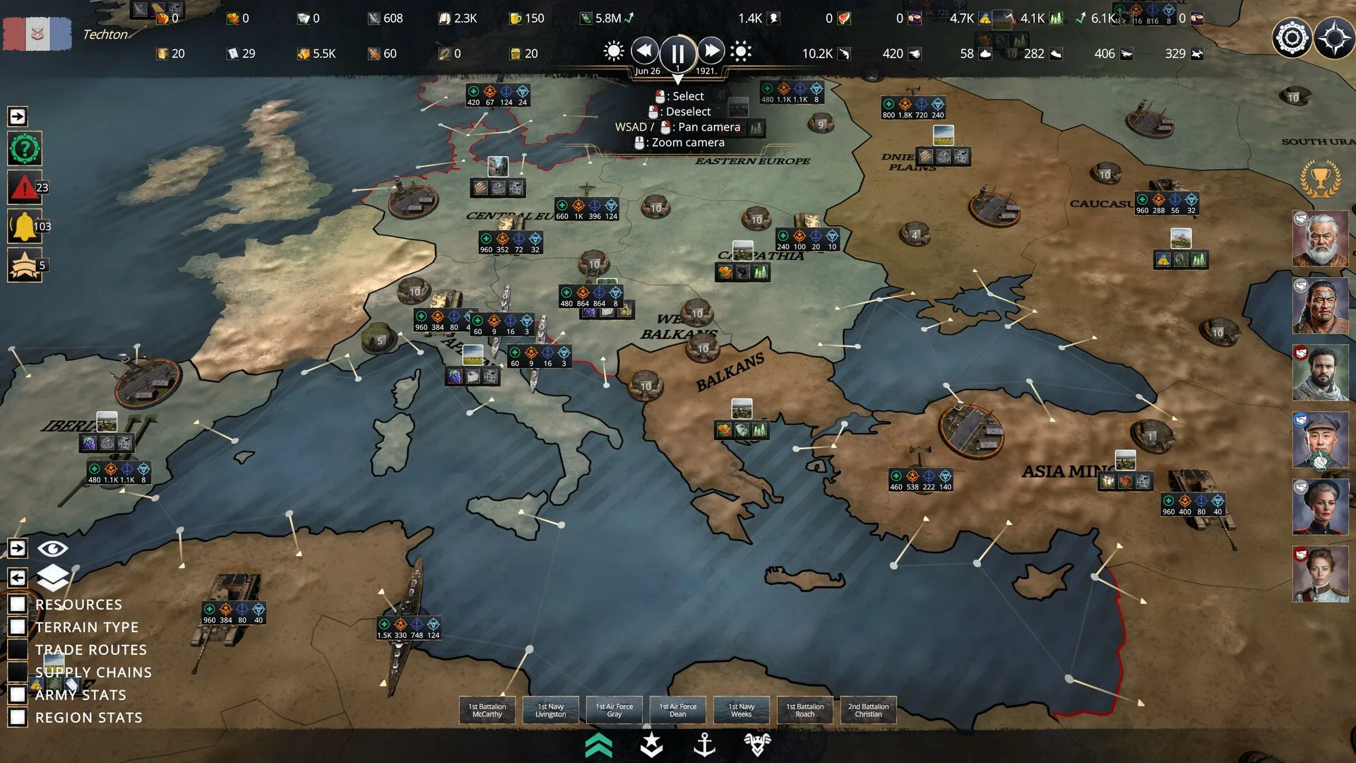 I due aspetti – city-building e grand strategy – sono sinergici: infatti la nostra città-stato in un primo momento servirà soprattutto a iniziare la corsa al riarmo, iniziando, come tipico del genere, con catene di produzione basilari come cibo, vestiti e altri beni primari, per poi progredire verso prodotti molto più complessi, inclusi (e soprattutto) quelli di natura militare.