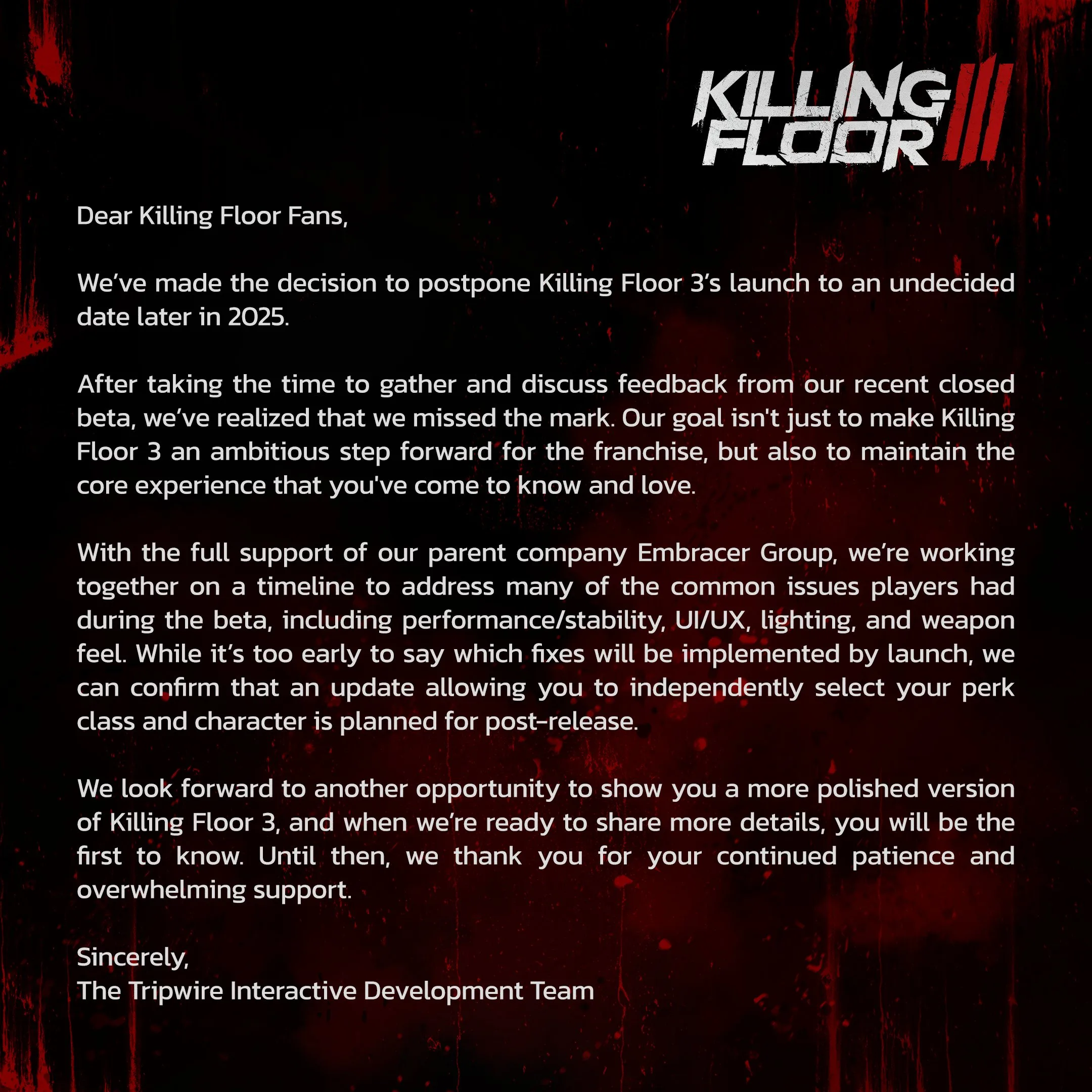 Tripwire Interactive ha annunciato che Killing Floor 3, il prossimo capitolo dell’acclamata saga, sarà posticipato e non uscirà più nella data annunciata del 25 marzo. Tripwire e la parent company The Embracer Group hanno spiegato che il team sta lavorando a diversi problemi prioritati da risolvere. Il lancio del gioco è ora previsto nel tardo 2025: chi ha preordinato il titolo potrà usufruire di un rimborso facendo riferimento alle FAQ per dettagli aggiuntivi.