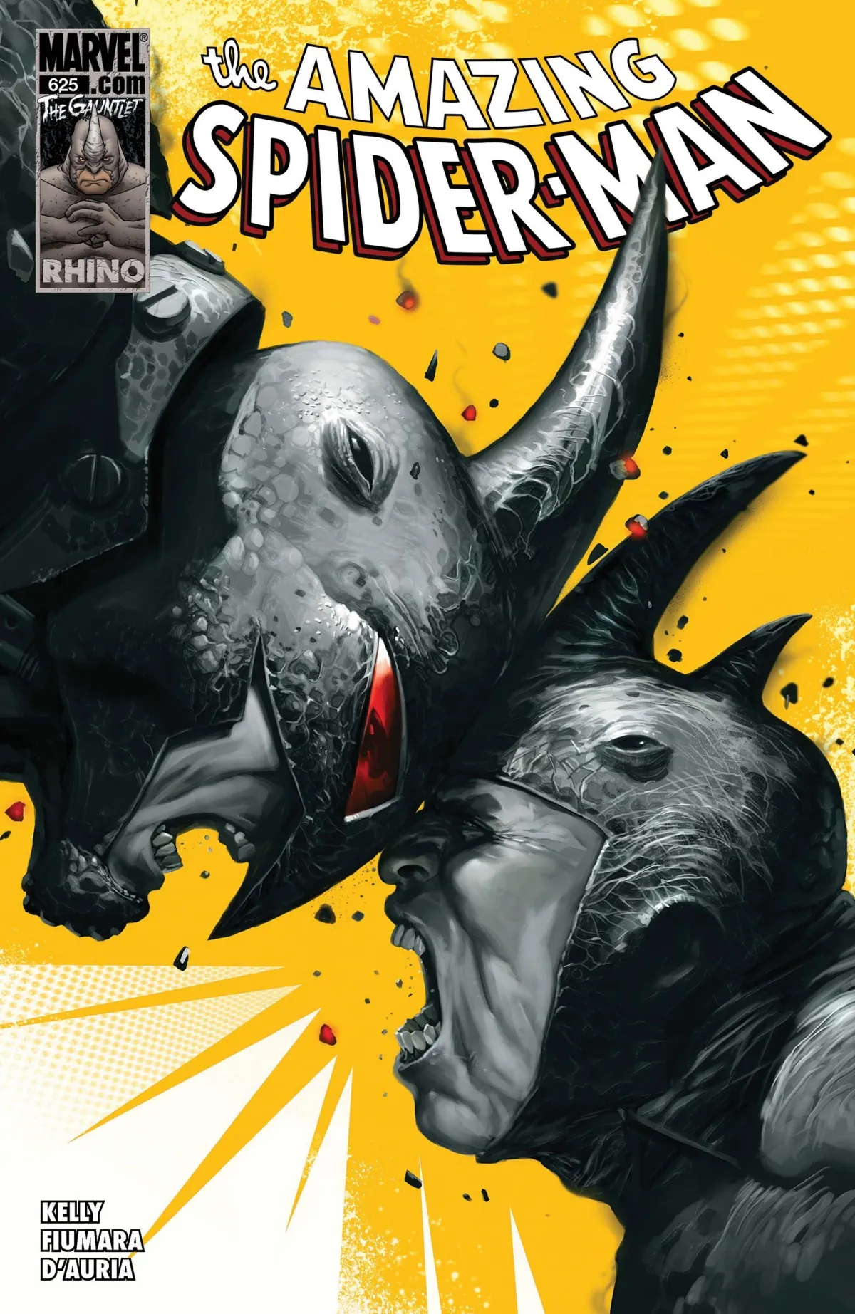 Il Rinoceronte furioso si presenta in Amazing Spider-Man #41 del 1966 con la missione di catturare il colonnello John Jameson, figlio astronauta di J. Jonah Jameson del Daily Bugle. L’Uomo Ragno non riuscì a competere con la forza bruta del Rinoceronte, ma la velocità e la prontezza di riflessi del Wall-Crawler gli permisero di stancare il suo avversario più grande e più forte.