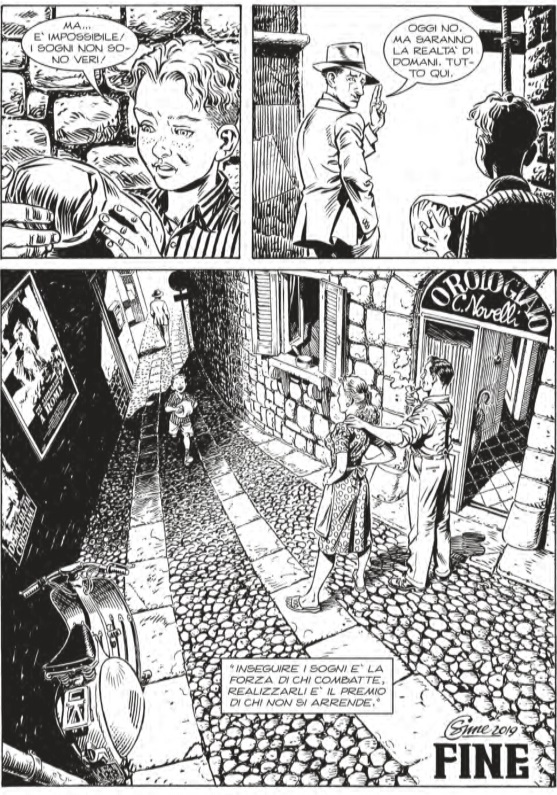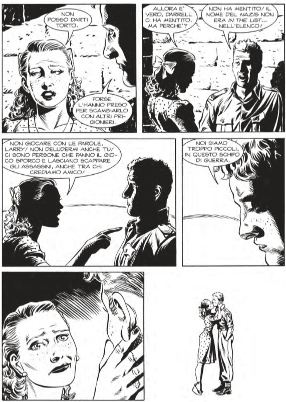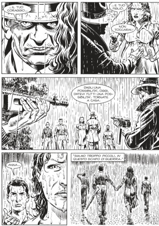L’altro concetto su cui Gigi Simeoni si sofferma è quanto gli esseri umani siano piccoli rispetto ad una tragedia immane come quella della guerra. L’autore lo ricorderà più volte attraverso delle stupende tavole, costruite per fermare il tempo della narrazione intorno a questo importantissimo concetto. Quello che ci lascia è la sensazione di sentirsi inermi innanzi ad un odio ed una distruzione cosi vasta e così spietata.