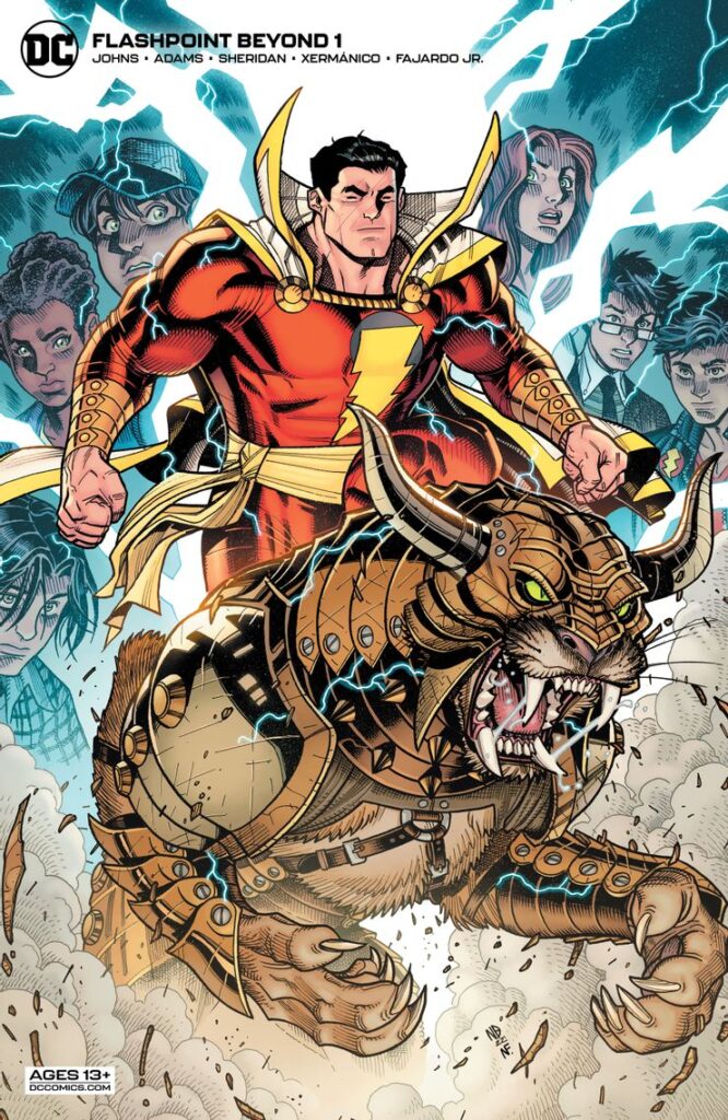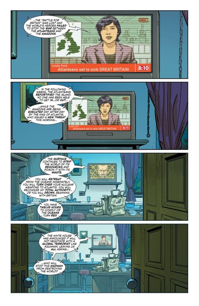 Un nuovo rapporto informa l’anziano Batman dello “stato di emergenza” in corso in Gran Bretagna in un’anteprima di Flashpoint Beyond #1, di Geoff Johns, Jeremy Adams, Tim Sheridan, Xermánico e Mikel Janín. Senza che la guerra sia stata fermata come apparentemente era nell’evento originale, gli Atlantidei avrebbero invertito la tendenza contro le forze amazzoniche e hanno iniziato a giustiziare i loro soldati. L’imperatore Aquaman rilascia una dichiarazione al mondo di superficie chiedendo la resa di tutte le forze nucleari e il riconoscimento globale della sua autorità suprema. Mentre la Casa Bianca si rifiuta di negoziare, Aquaman è risoluto nella sua promessa di annegare il mondo se le sue richieste non saranno soddisfatte.