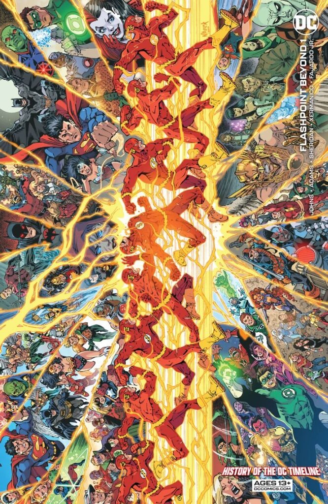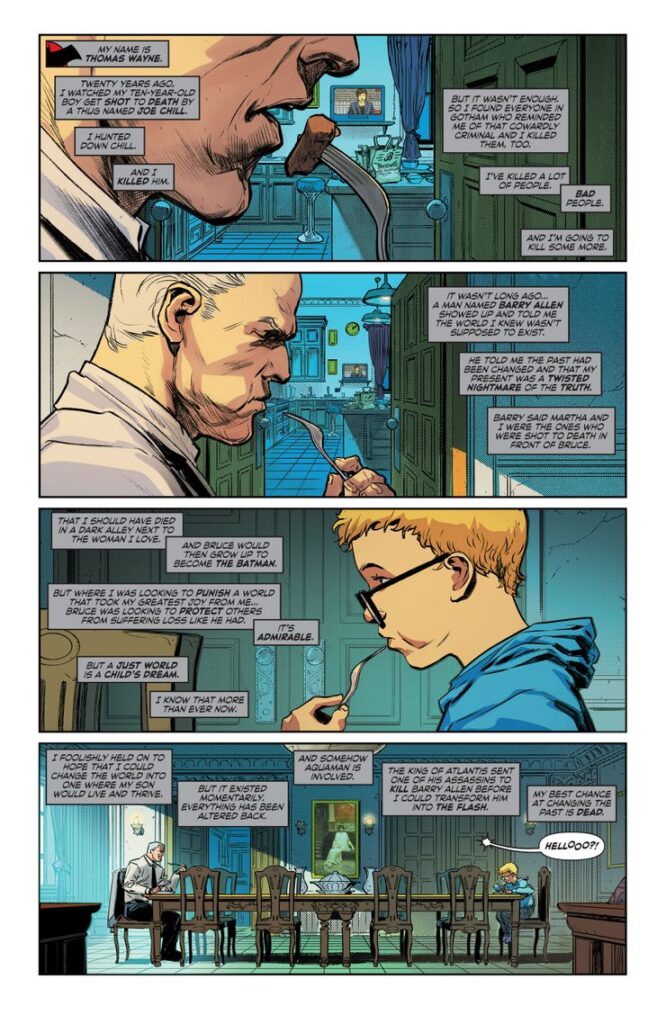 Quando Barry Allen è tornato indietro nel tempo per salvare la vita di sua madre, ha accidentalmente creato Flashpoint. La linea temporale divergente che è una delle versioni più oscure immaginabili dell’Universo DC. Bruce Wayne è stato ucciso a colpi di arma da fuoco al posto dei suoi genitori. Superman ha trascorso tutta la sua vita in prigione e il mondo stava per dividersi in due per una guerra tra Atlantide e le Amazzoni. Per fortuna Flash ha ripristinato la linea temporale ma con il ritorno del Batman di Thomas Wayne il futuro oscuro non e’ certo migliorato.