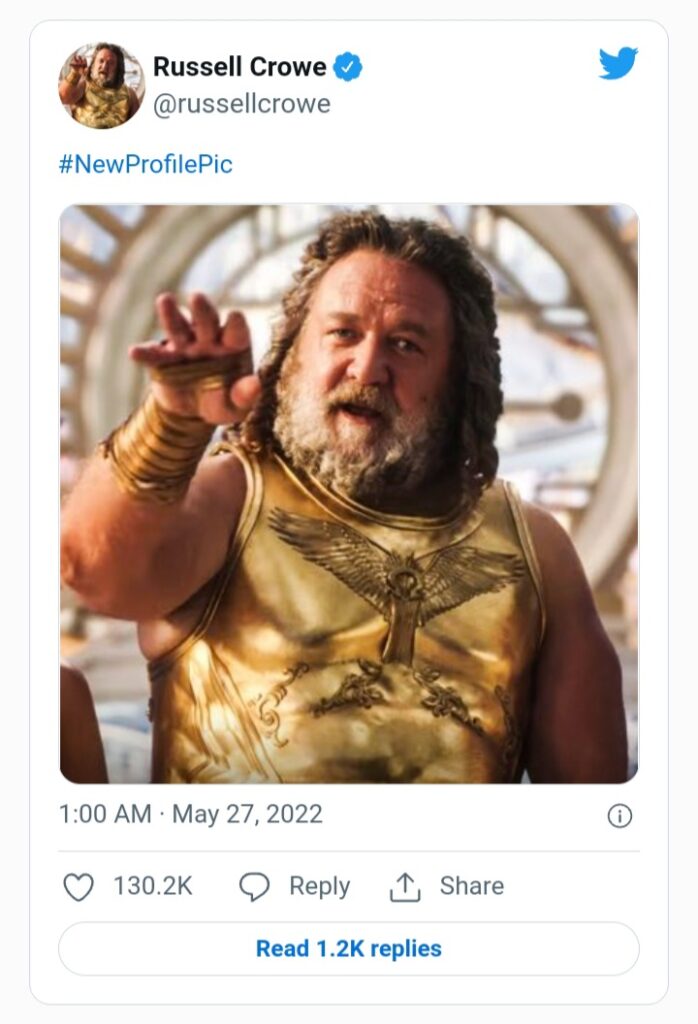 L’immagine che Crowe ha scelto per il suo nuovo avatar su Twitter è quella di Zeus proprio mentre muove la mano destra verso Thor negli ultimi momenti del trailer. Scena in cui subito dopo la veste di Thor viene spogliata dal suo corpo. Mostrandolo completamente nudo a coloro che sono presenti su quello che molto probabilmente è l’Olimpo, la casa degli dei greci.