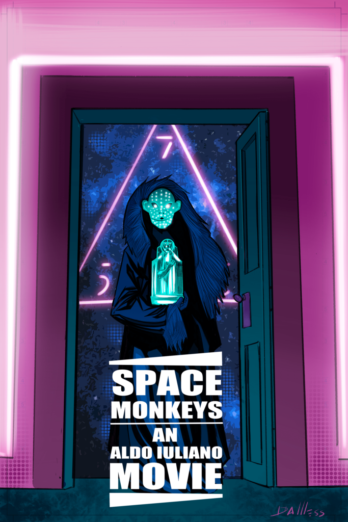 “Per realizzare questa illustrazione, in un tempo di lavorazione limitato alla proiezione del film, mi sono concentrato soprattutto sugli elementi simbolici presenti nella pellicola. Come Able, l’intelligenza artificiale domotica, che governa in maniera subdola le scelte dei ragazzi e sulla simbologia della scimmia ben rappresentata nel film dalle onnipresenti maschere”, ha dichiarato David Messina. “La parte più complessa è stata riutilizzare una palette cromatica che restituisce fedelmente quella del film, ricercata ed estremamente moderna. La porta, altro simbolo ricorrente nel lavoro di Iuliano, mi era sembrata la giusta cornice per il futuro inquietante a cui la storia sembra condannare le nuove generazioni e tutti noi con loro”.