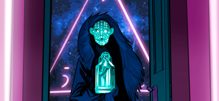 “Per realizzare questa illustrazione, in un tempo di lavorazione limitato alla proiezione del film, mi sono concentrato soprattutto sugli elementi simbolici presenti nella pellicola. Come Able, l’intelligenza artificiale domotica, che governa in maniera subdola le scelte dei ragazzi e sulla simbologia della scimmia ben rappresentata nel film dalle onnipresenti maschere”, ha dichiarato David Messina. “La parte più complessa è stata riutilizzare una palette cromatica che restituisce fedelmente quella del film, ricercata ed estremamente moderna. La porta, altro simbolo ricorrente nel lavoro di Iuliano, mi era sembrata la giusta cornice per il futuro inquietante a cui la storia sembra condannare le nuove generazioni e tutti noi con loro”.