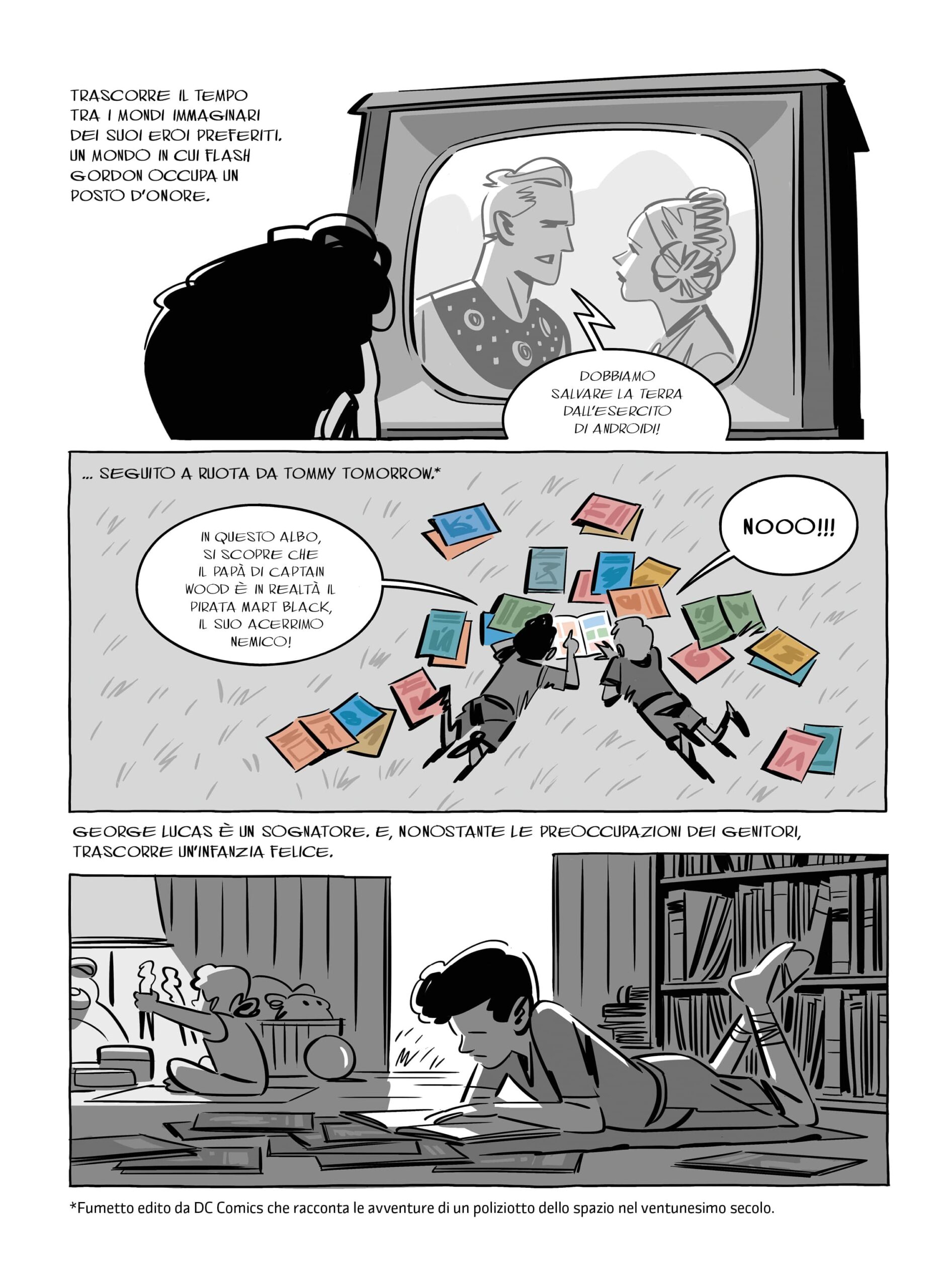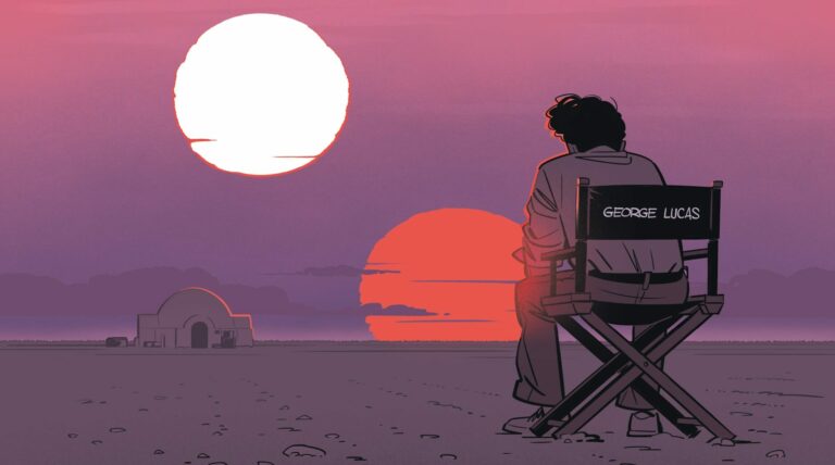 Con Le guerre di Lucas, Renaud Roche e Laurent Hopman compiono un lavoro straordinario nel ricostruire la vita di George Lucas partendo dall’infanzia fino all’uscita di Star Wars. Al di là di un paio di salti temporali, la storia procede in maniera lineare mostrandoci solo a grandi linee la giovinezza del regista, prima di dedicare ampio spazio ai primi anni di carriera e, soprattutto, alla lunga e travagliata lavorazione del film. Il ritratto di George che esce da queste pagine è quello di una persona molto schiva e dal carattere riservato, ma anche un grande sognatore, disposto a mettere a rischio anche la propria salute per coronare un sogno.