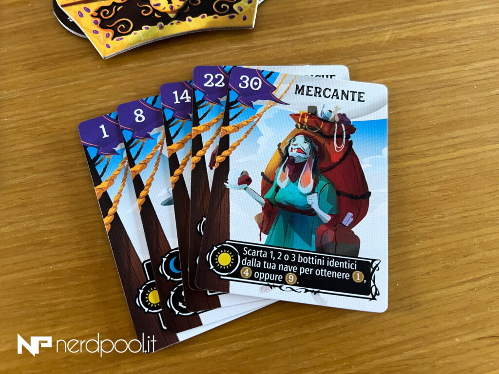 Quindi perché dovresti mai ingaggiare un personaggio di grado più alto se i gradi più bassi possono influenzare prima lo stato del gioco? Dopo che tutti i poteri diurni si sono attivati, sono i pirati di rango più alto che si avventano per primi sulle tessere bottino. Questo, ovviamente, purché i personaggi di rango superiore non siano stati cacciati a calci fuori dalla nave da un subdolo membro dell’equipaggio durante il giorno.