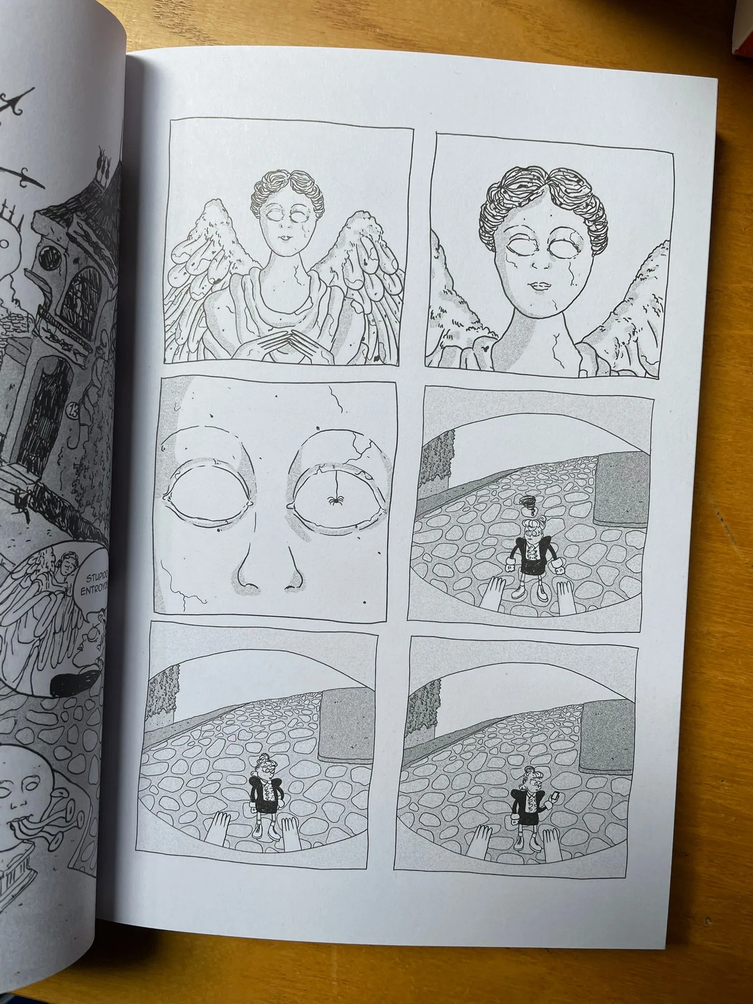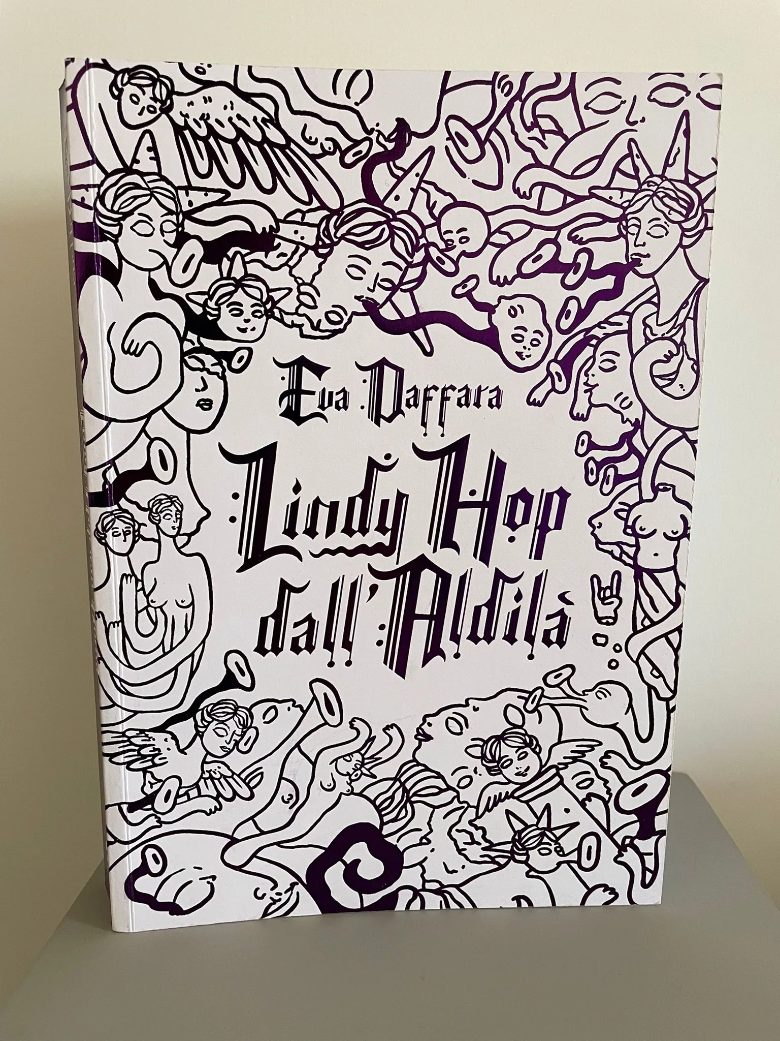 Una notte, delle grandi statue di angeli e creature deformi sono misteriosamente comparse in tutta Accabarì e nei dintorni della città. La popolazione locale ha imparato a conviverci, pur non sapendo nulla sulla loro natura. Da questa premessa prende il via Lindy Hop dall’aldilà, fumetto d’esordio e tesi di laurea di Eva Daffara, con il quale ha vinto la borsa di studio della Fondazione Tuono Pettinato nel 2014 e uscito ora per Eris Edizioni.