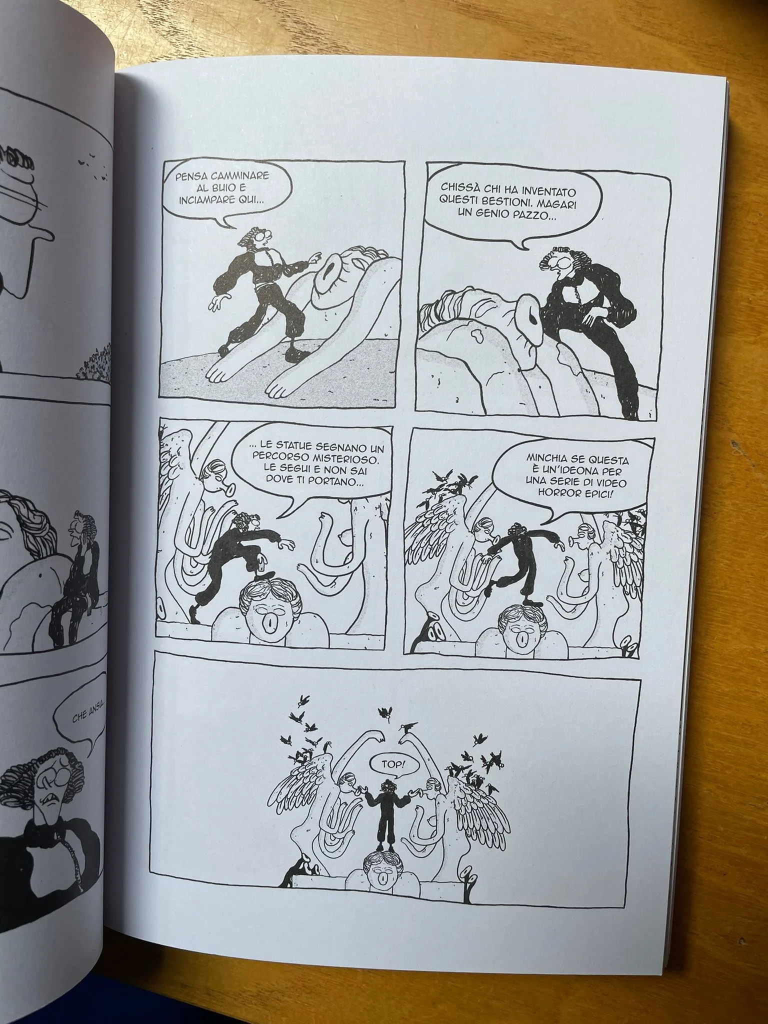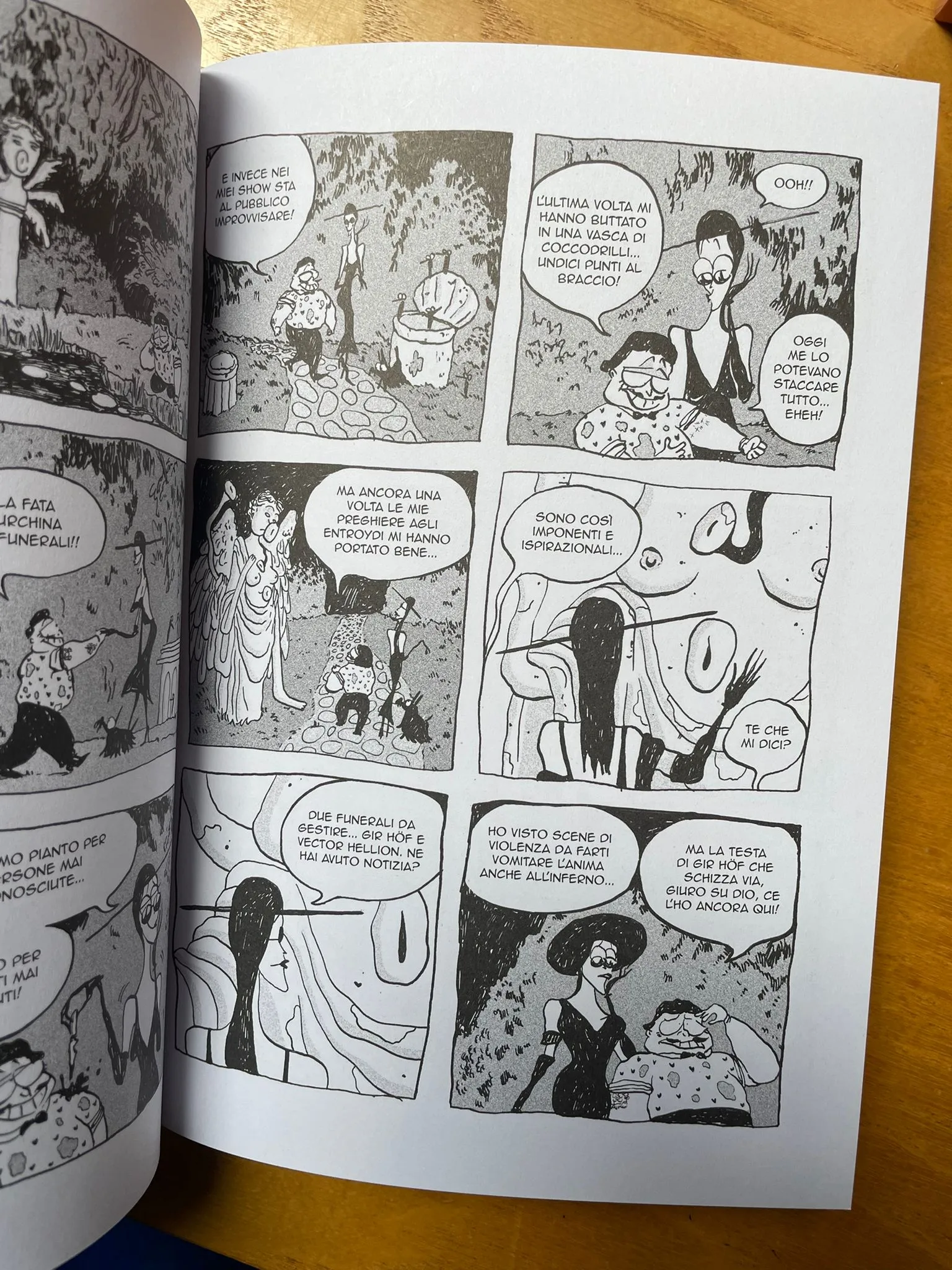 L’autrice dà vita a moltissime situazioni grottesche. Tra corse folli di auto, spettacoli di stand-up comedy e partite di poker all’ultimo sangue, succede di tutto ad Accabarì, ma il ritmo del racconto non è per nulla frenetico, alternando bene scene caotiche ad ampi paesaggi e momenti più riflessivi. Il tratto psichedelico e cartoonesco dell’autrice trova posto in tavole con una gabbia piuttosto standard, scelta che rende agevole la lettura ma che ci impedisce forse di vedere al massimo la grande creatività e il talento di Eva Daffara. Sicuramente avremo modo di rivederla all’opera e Lindy Hop dall’aldilà è un ottimo biglietto da visita, esaltato dalla bella veste grafica scelta da Eris Edizioni.