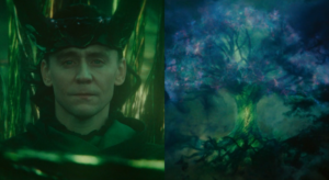 Una delle sequenze finali della puntata mostra il Dio dell’inganno esporsi all’energia temporale radioattiva. Invece di morire ‘spaghettificato’ inizia a trasformare i suoi abiti in una mise molto piú in linea con la sua natura. Lo vediamo poi distruggere il Telaio con le sue stesse mani e disfarsi di tutte le linee temporali. Successivamente, spinto dalla determinazione e dall’amore verso Silvye ed i suoi amici, afferra le varie ramificazioni morenti donando ad esse nuova linfa. Lo vediamo infine sedersi sul trono fuori dal tempo, intento a reggere tutte le varie linee temporali del multiverso, assicurandosi un corretto flusso di tutto il cosmo.