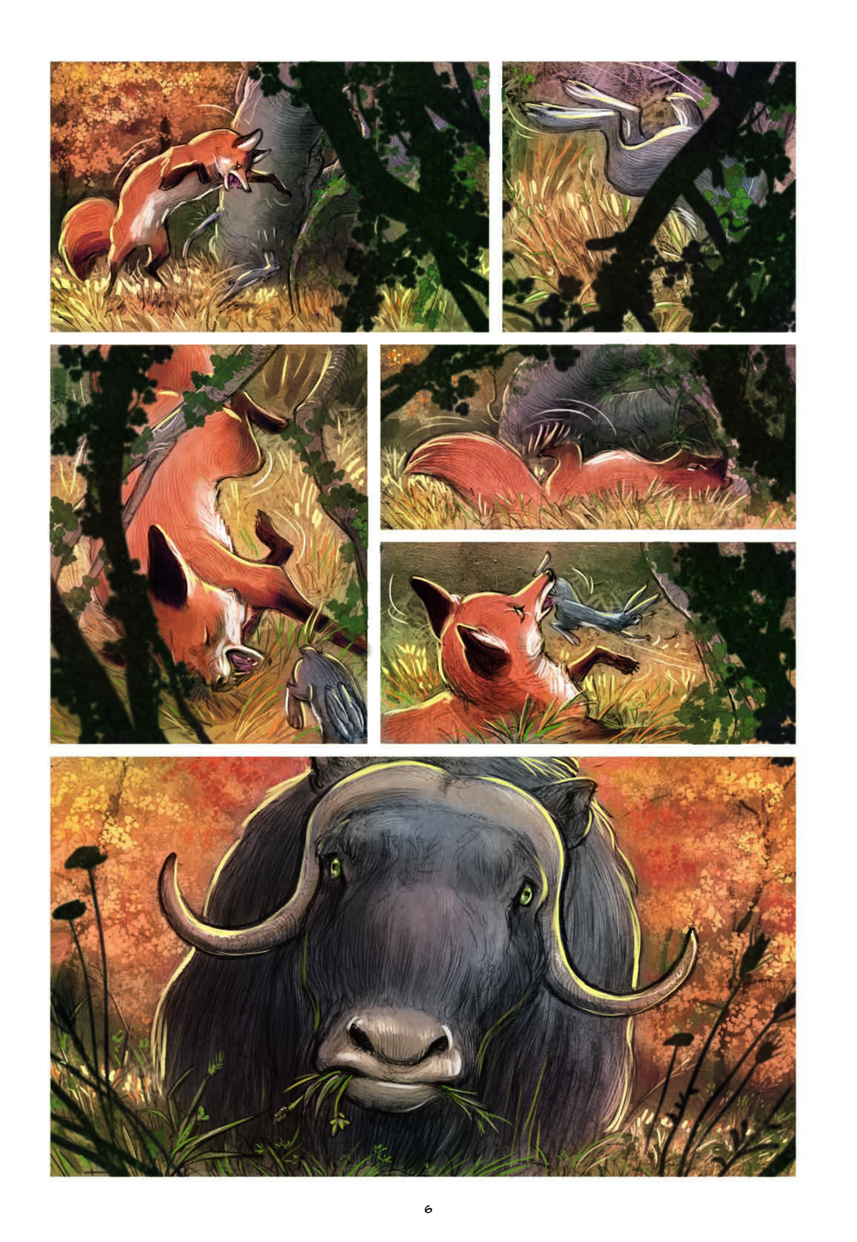 Love: La Volpe nasce dal fantastico team dell’artista Federico Bertolucci e dello scrittore Frédéric Brrémaud ed è un perfetto esempio di ciò che questo tipo di storie possono rappresentare. La loro narrazione non è solo fluida e accessibile, ma assolutamente bella. L’eccezionale arte di Federico Bertolucci è evidente su tutte le tavole, forse figlia degli anni passati con la Disney. Questo stile a matita e acquerello, unito alla sua capacità di presentare un’ampia presentazione in stile cinematografico, mi lascia senza fiato. E il volume non è fatto solo da suggestioni bucoliche, ma c’è una grande gestione anche dei momenti ricchi di azione!