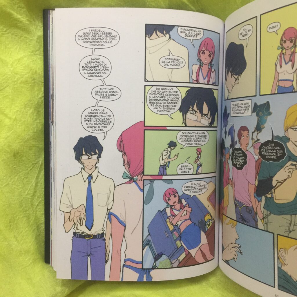 Luce e Cosmo è un bel fumetto, molto interessante l’uso dei colori, vibranti e decisi con il giusto contrasto tra positivo e negativo in diverse scene proprio per il loro utilizzo. Lo stile di Yi Yang è perfetto per questa storia che sarà semplice ma è bella e riesce ad appassionare anche un pubblico giovane come quello al quale è indirizzata la collana dove è pubblicato. C’è da dire che ci sono alcune scene un po’ mature ma niente di sconveniente o problematico. Per me è stata la prima esperienza con questo duo di giovani autori e mi è rimasta la curiosità e la voglia di leggere altro di loro e vedere che cosa ci racconteranno in futuro.
