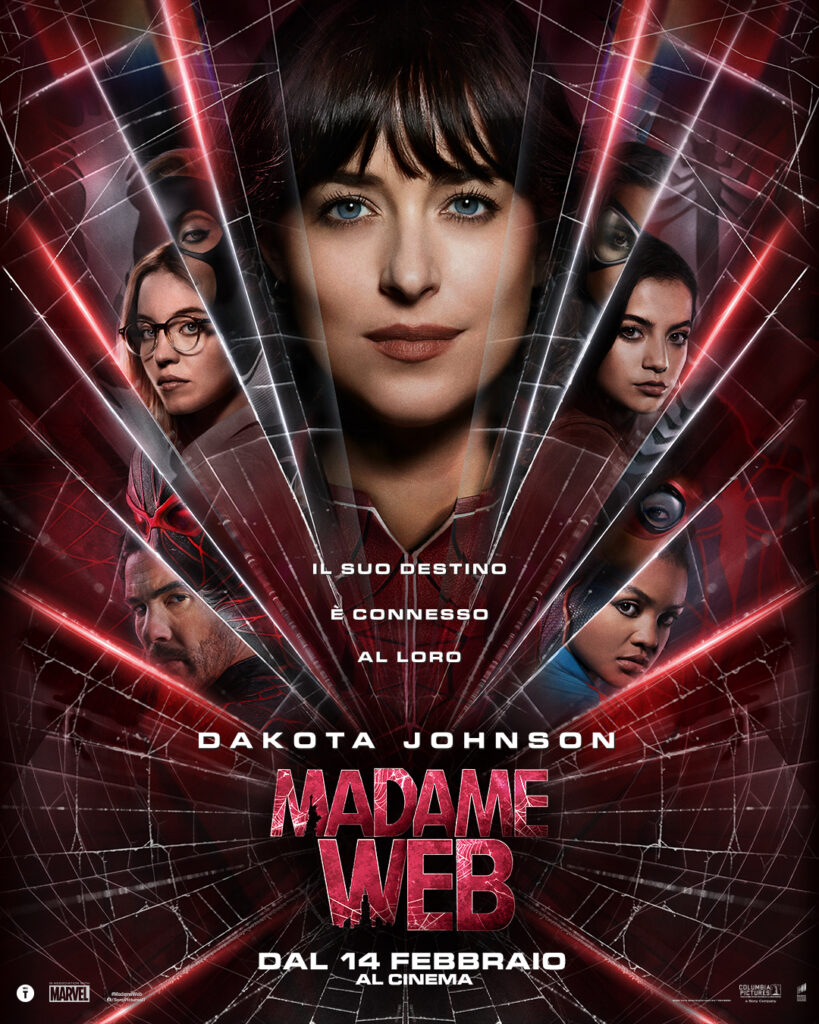 Poche ore fa, Sony Pictures Italia ha diffuso in rete il nuovo poster ufficiale di Madame Web, il film con protagonista Dakota Johnson che arriverà al cinema il 14 febbraio 2024.