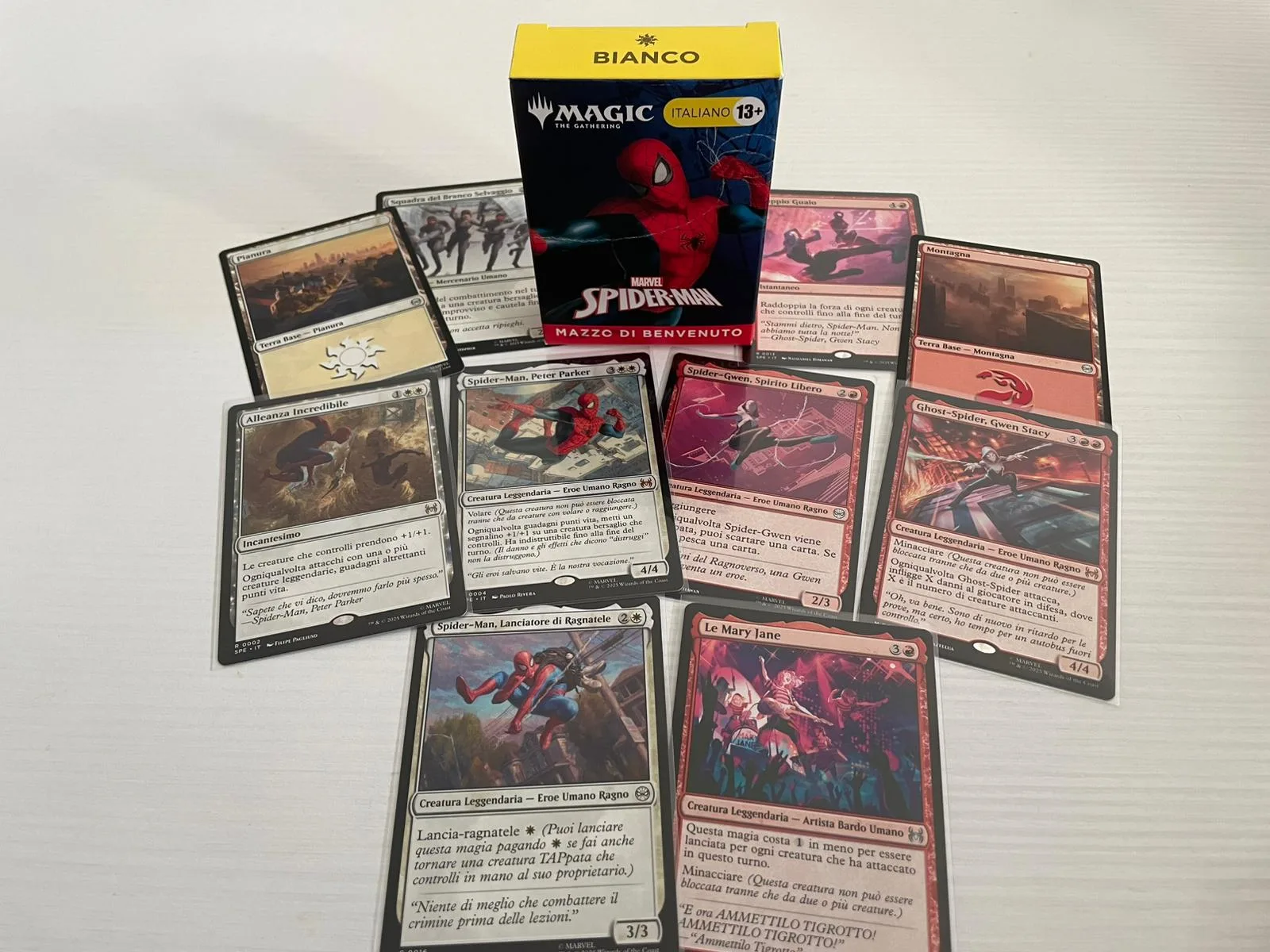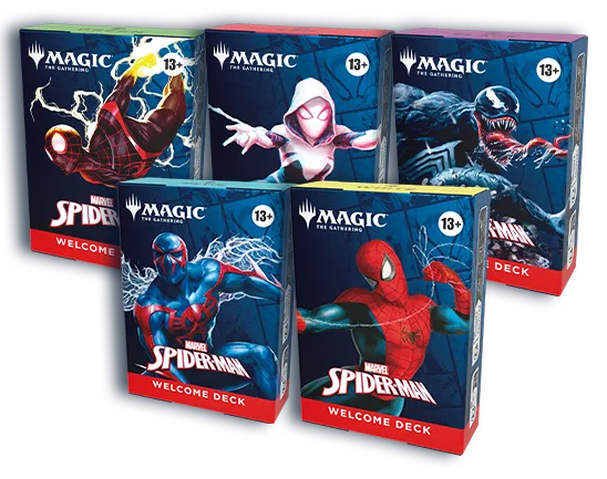 Come anticipato, questa nuova espansione non vuole presentare ai giocatori solo la storia di Peter Parker, ma abbracciare l’intero Spider-Verse. Personaggi che prima restavano relegati sui fumetti, negli ultimi anni, soprattutto grazie al cinema e alle serie tv, sono diventati popolarissimi e amati da appassionati di tutte le età. I nomi più noti sono probabilmente quelli che figurano nei Mazzi di benvenuto (Welcome deck) presentati in questa nuova espansione e che costituiscono la perfetta porta d’ingresso anche a chi si avvicina per la prima volta al mondo di Magic.