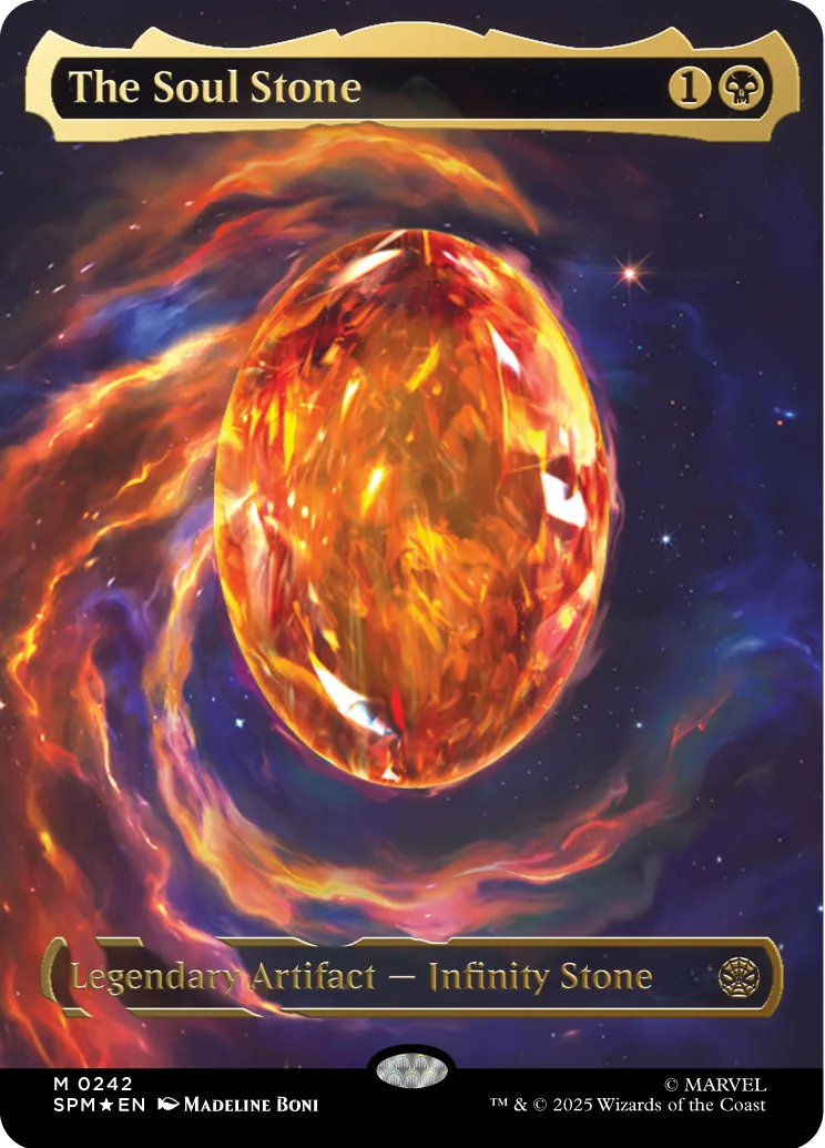 A ogni modo, chi, come me, viene dal mondo del fumetto si troverà ad ammirare le stupende illustrazioni del set, che riescono a unire perfettamente lo stile di Magic con quello della Marvel, presentando nel set base disegni di artisti come Ben Harvey, John Tyler Cristopher, Domenico Cava o Jim Cheung. Ma non finisce qui…chi è interessato solamente agli artwork o al valore collezionistico potrà divertirsi a sbustare per trovare le carte più rare appartenenti a varie tipologie. Ad esempio le carte che presentano cover iconiche legate a Spider-Man senza bordo o, la più bramata di tutte, la versione ultra-rara della Gemma dell’Anima (e chissà che non vedremo presto le altre gemme nei prossimi set!).