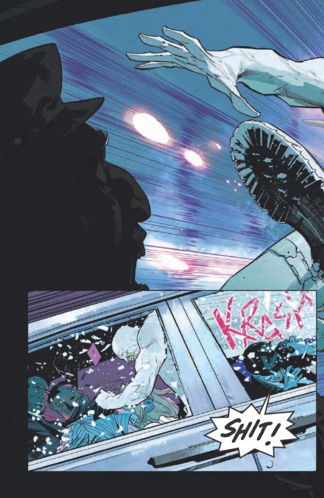 Nemesis: Reloaded #1 è opera dello scrittore Mark Millar e dell’artista Jorge Jiménez. Nell’anteprima, un uomo e una donna escono da un locale di Los Angeles discutendo della filmografia di Quentin Tarantino con il loro autista e la loro guardia del corpo quando, all’improvviso, la conversazione viene interrotta dall’improvvisa apparizione di Nemesis, che si schianta violentemente contro il parabrezza, prende in braccio uno dei passeggeri e poi vola via. L’uomo si ritrova poi in piedi, accanto ad altre persone che Nemesis ha apparentemente prelevato, all’interno di una piscina vuota.