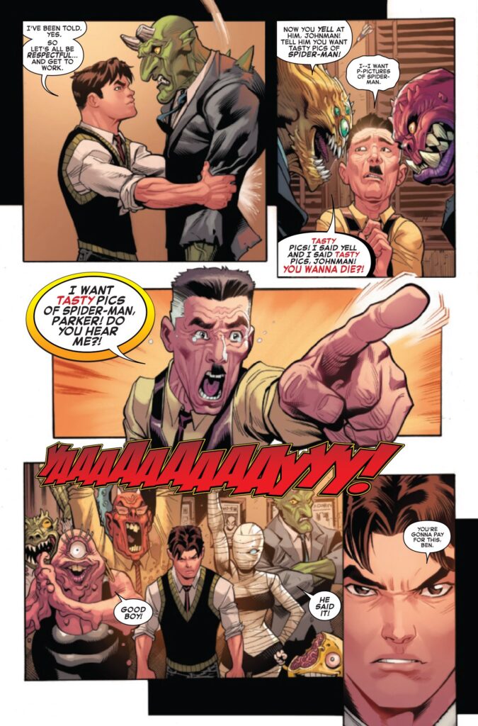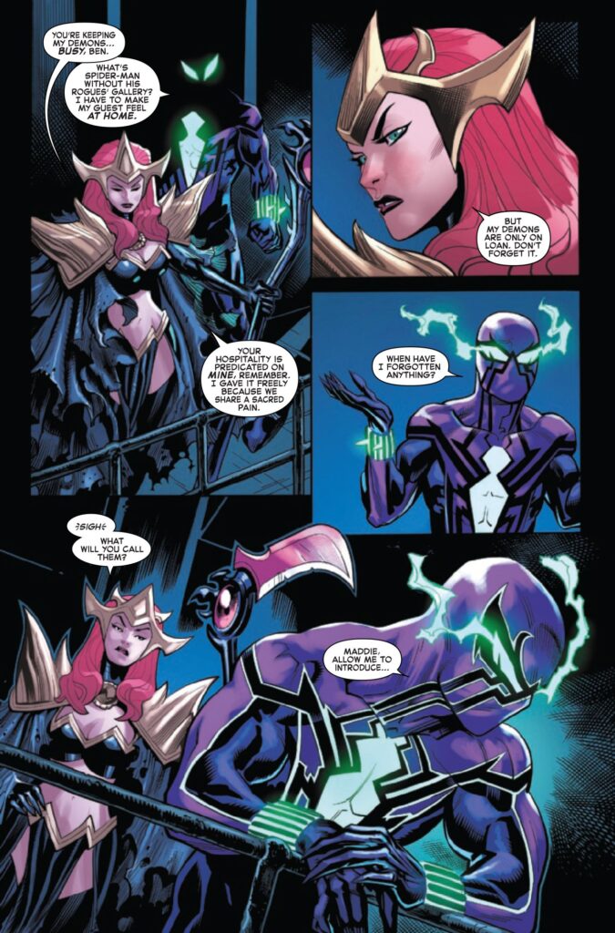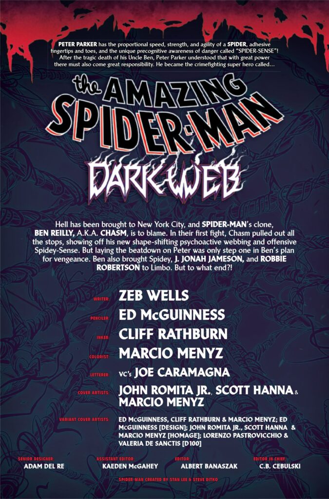 Prima di Ben e degli Insidiosi Sei, Peter ha già dovuto combattere Venom come ai vecchi tempi, dato che Ben e Madelyne hanno incasinato la mente di Eddie Brock e lo hanno fatto regredire al suo io che odia l’Uomo Ragno. Al di fuori dei due numeri di chiusura dell’evento, Dark Web: Dusk e Dark Web: Dawn, l’elenco completo delle testate coinvolte in Dark Web comprende ASM, Venom, Dark Web: X-Men, Mary Jane & Black Cat, Gold Goblin e Dark Web: Ms. Marvel. The Amazing Spider-Man #14 ha fatto da preludio a Dark Web e ha indicato che Ben e Madelyne vogliono rubare le anime di Peter e Jean, ma in base all’anteprima sembra che Ben voglia torturare Peter in anticipo.