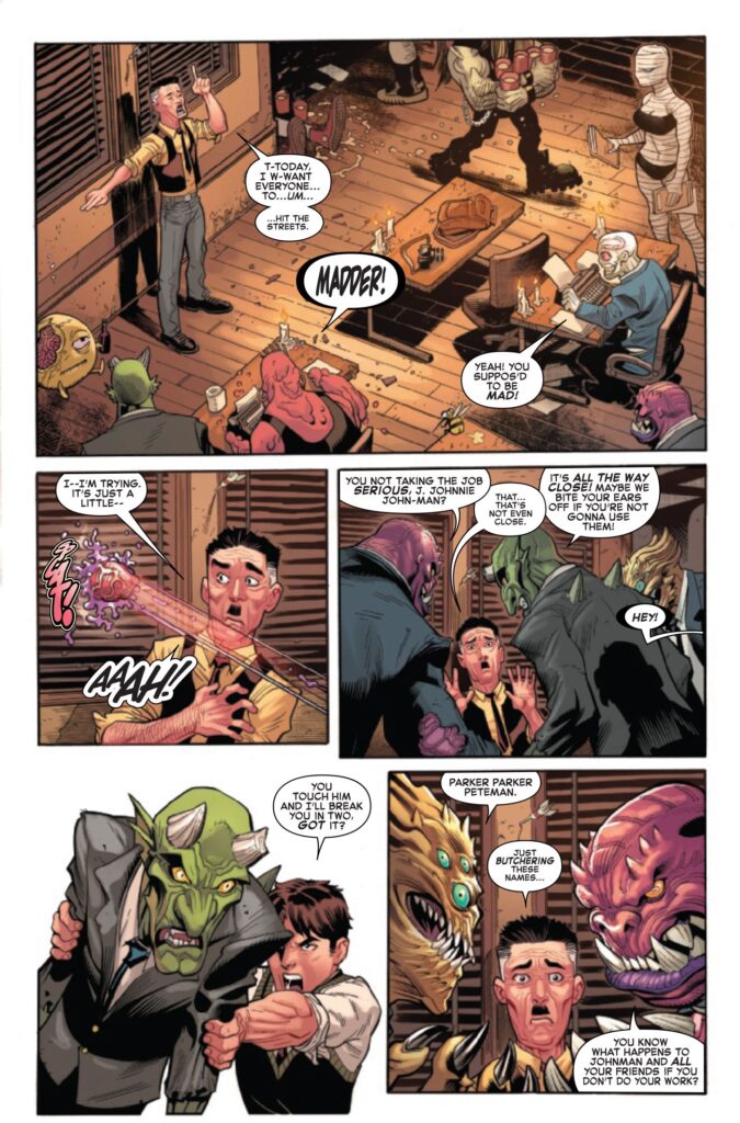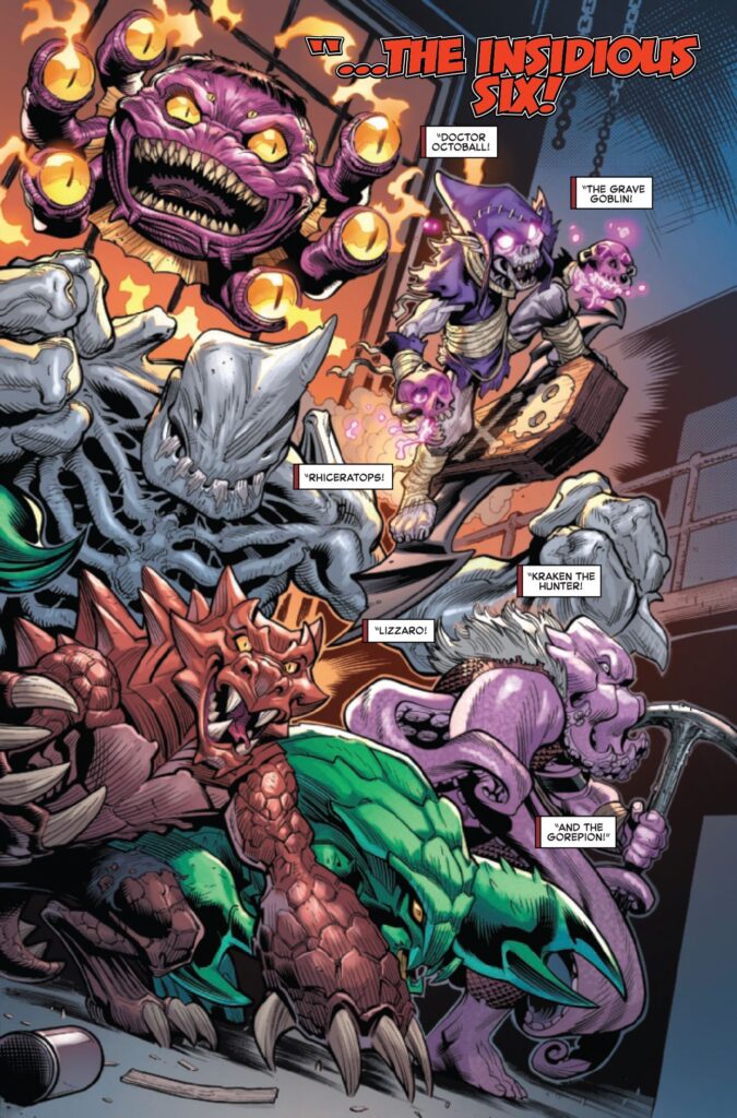 Scritto da Zeb Wells e illustrato da Ed McGuinness, l’anteprima di The Amazing Spider-Man #17 riprende subito dopo il numero precedente in cui Peter si è lasciato trascinare nel Limbo nel tentativo di salvare J. Jonah Jameson e Robbie Robertson. I due sono stati rapiti e costretti nel mondo infernale da Ben Reilly, alias il cattivo Chasm, che vuole fare del male a Peter in seguito agli eventi della storyline “Beyond” di ASM. Come mostrato nell’anteprima, il prossimo metodo di Ben per tormentare Peter consiste nel trasformare alcuni dei demoni del Limbo in versioni distorte dei cattivi dei Sinistri Sei e nel chiamare la squadra “Insidious Six”.