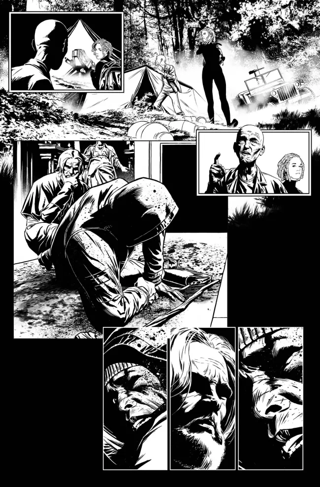 La pagina in bianco e nero (vedi sotto) è la tipica arte dettagliata e atmosferica di Quesada, che raffigura diversi personaggi che guardano preoccupati, anche se non è chiaro cosa stia succedendo e chi siano queste persone.