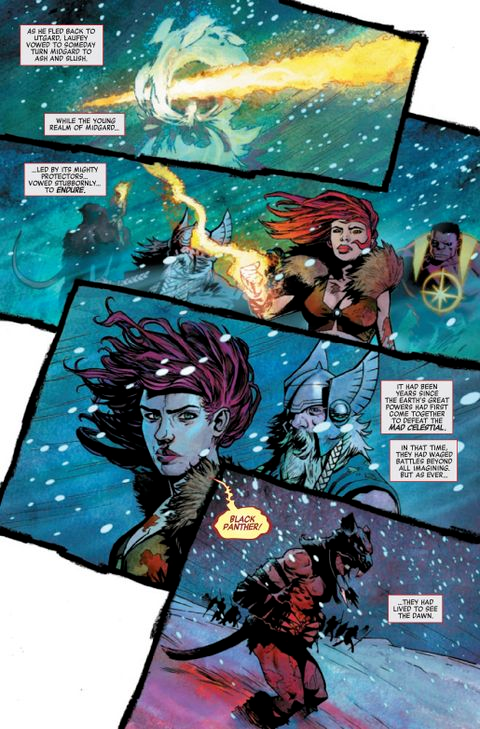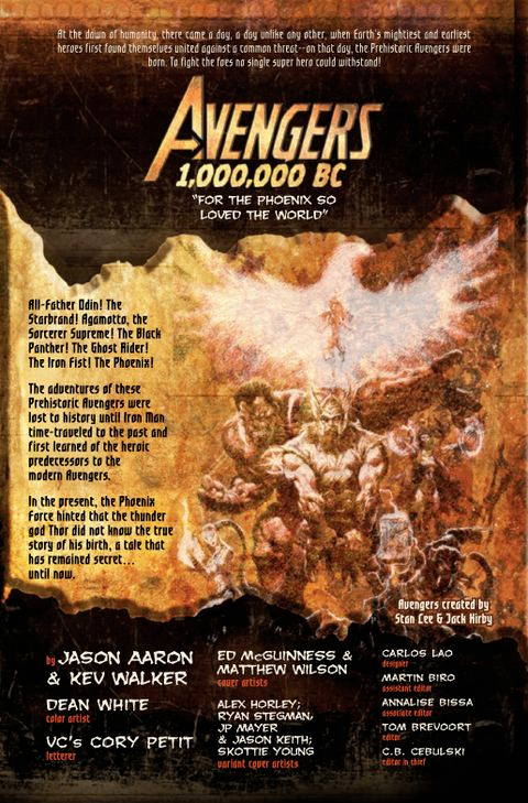 Sia la copertina che la pagina di riepilogo di Avengers 1.000.000 a.C. #1 lasciano presagire che la Marvel rivelerà finalmente la storia completa delle origini di Thor. Il racconto inizia con una battaglia in cui molti morirono nel corso di “settanta giorni e settanta notti” che si guadagnò l’ira di Laufey dei Giganti di Ghiaccio. I Vendicatori del passato, anni dopo, sono in viaggio attraverso una bufera di neve. Pantera Nera finisce per morire. Odino dice a Fenice, che sta lamentando la morte di Pantera Nera, di non affezionarsi troppo ai mortali. Questo fa sì che Phoenix esploda di rabbia e lo rimproveri per la sua mancanza di rispetto, portando a una specie di lotta tra i due amanti.