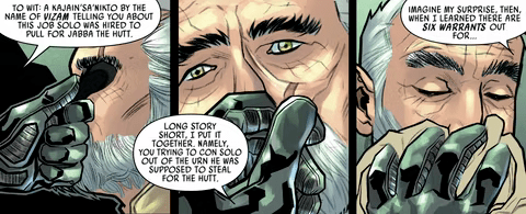 Mentre Han e Chewbacca vengono catturati da Greedo e dalla sua banda all’inizio di Star Wars: Han Solo & Chewbacca #5, il numero vede anche l’uomo che si spaccia per il padre di Han Solo – introdotto per la prima volta in Star Wars: Han Solo & Chewbacca #1 – catturato da uno sceriffo di nome Buck Vancto. “Vado a cercare Han Solo e trovo… un tizio che sostiene di essere suo padre”, racconta Vancto. “Volete sapere come è successo? È una bella storia. Ho chiesto a Bib Fortuna una linea su Solo. Invece mi ha dato delle informazioni. Per intenderci: un Kajain’sa’Nikto di nome Vizam che vi parlava di un lavoro che Solo era stato assunto per conto di Jabba the Hutt. Per farla breve, ho messo insieme i pezzi. In particolare, tu hai cercato di truffare Solo per sottrargli l’urna che avrebbe dovuto rubare per conto degli Hutt”.