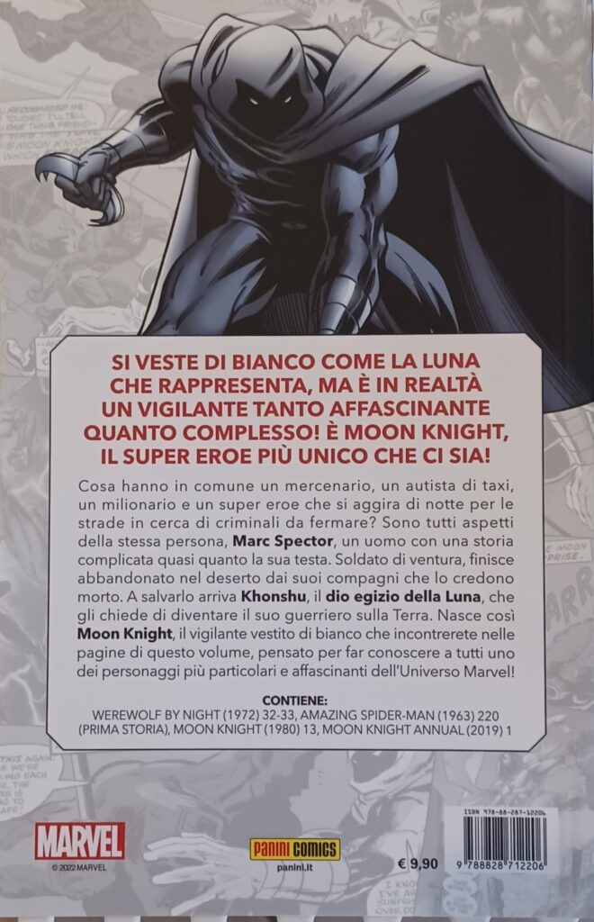 A un passo dalla morte, il mercenario Marc Spector viene salvato da Khonshu, il Dio della Luna. Da quel momento diventa Moon Knight, l’eroe che protegge le persone che si muovono di notte. Con le sue identità multiple, il Cavaliere Lunare è uno dei più misteriosi e affascinanti vigilanti dell’Universo Marvel. Cinque racconti che lo vedranno alle prese con un licantropo, Spider-Man e Daredevil e un’affascinante avventura attraverso il tempo. Un volume dedicato al più misterioso eroe Marvel, perfetto per i nuovi lettori e per chi volesse conoscere meglio il personaggio in vista della serie Disney+.
