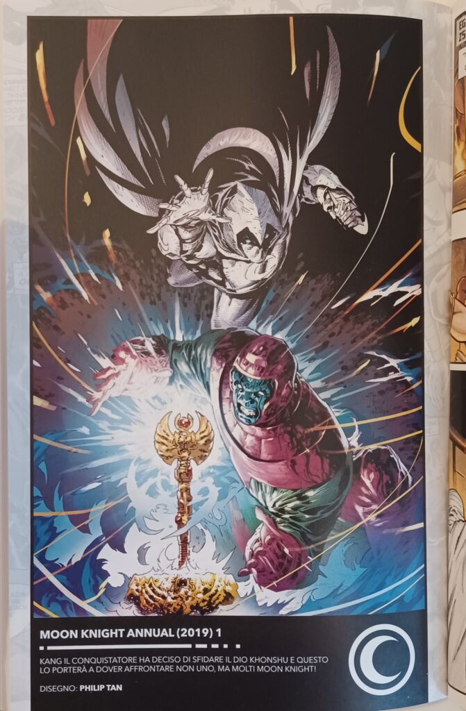 Quando ci si vuole approcciare a un nuovo eroe nei fumetti, è spesso complicato perché non si sa mai da dove cominciare. Questo volume della serie Marvel-Verse, che è una buona raccolta di racconti su Moon Knight, è il giusto inizio che ti fa conoscere il personaggio e le sue sfaccettature senza confondere o esagerare con le informazioni. Un volume a tratti un po’ confuso, in cui i disegnatori Ibrahim Moustafa e Matt Horak (tra gli altri) si divertono a ridisegnare il look di innumerevoli Moon Knight di differenti epoche.