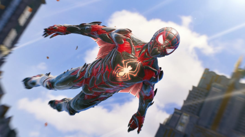 La tuta rossa e nera di Miles è rimasta sostanzialmente invariata rispetto a quella proposta in Spider-Man: Miles Morales, anche se sembra sfinate la silhouette dell’eroe.