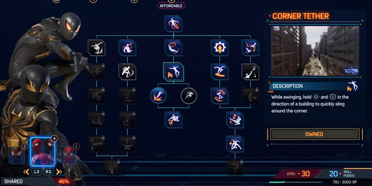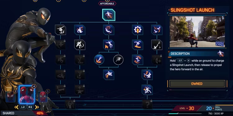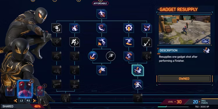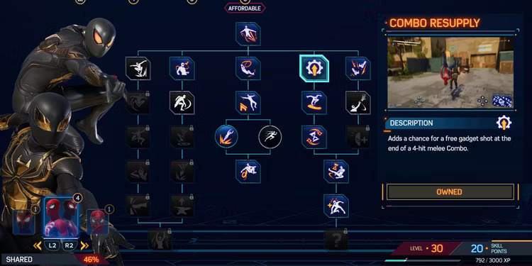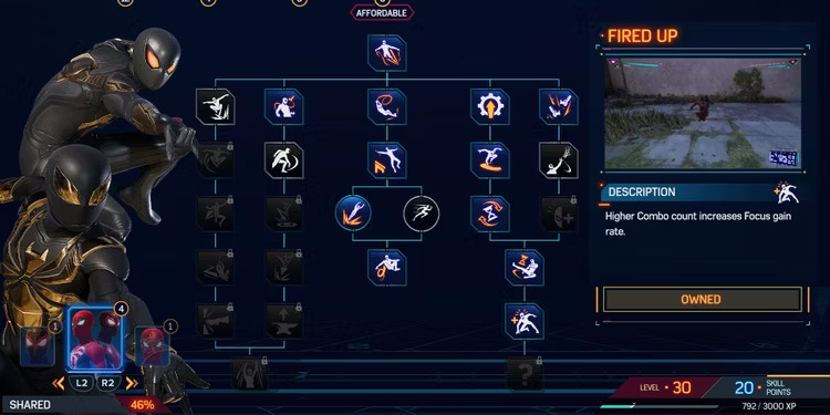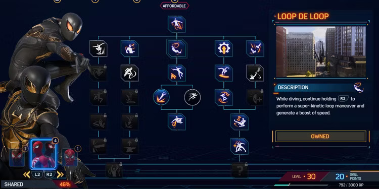Nello specifico ci sono 62 abilità da sbloccare nei tre alberi delle abilità di Marvel’s Spider-Man 2, ma le più utili da sbloccare presto si trovano nell’albero delle abilità condivise che, come suggerisce il nome, sono utilizzate sia da Miles che da Peter.