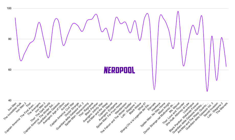 Ma a partire da Eternals (sempre nel 2021 e primo prodotto del MCU ad essere certificato Rotten/Marcio che nel grafico è il primo picco verso il basso che arriva a sfiorare la linea del 40%) inizia un trend che si può tranquillamente definire discendente.
