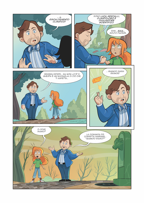 A descrivere l’urgenza di un repentino cambiamento climatico è proprio Mercalli che, accompagnando la sua giovane amica in un viaggio nel futuro, mostra come diventerà la nostra terra se non invertiamo subito la rotta. Cosa ne sarà di Venezia? Cosa ne sarà dei ghiacciai, dei mari, della Terra come noi oggi la conosciamo? Mercalli e Gaia viaggiano in avanti negli anni, raccontano cosa diventeremo e propongono soluzioni: torneranno, infatti, in un “oggi” più sostenibile e attento all’ambiente che ci circonda.