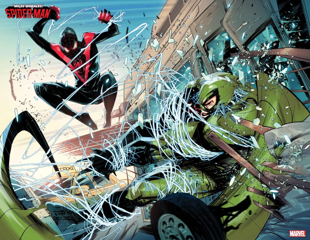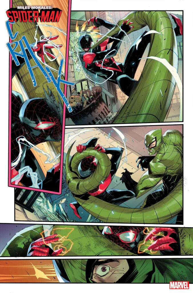 Miles Morales: Spider-Man #1 è realizzato dallo scrittore Cody Ziglar, dall’artista Federico Vicentini e dal colorista Bryan Valenza. Miles Morales è impegnato in un’accesa battaglia con Scorpion, con le tavole di Vicentini e Valenza che evidenziano l’energia cinetica di ogni mossa offensiva e difensiva di Miles e Scorpion. Dopo che Miles ha salvato un passante innocente, Scorpion blocca l’eroe nella sua coda. Prima che Scorpion possa stringere, Miles scatena la sua esplosione di Venom. La Marvel conclude l’anteprima con un Miles in lacrime che riceve una telefonata dai suoi genitori.