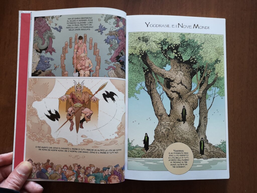 Tutti conoscono le divinità scandinave, ma quanti di loro sanno come crearono l’uomo? Proprio da qui ha inizio Miti del Nord, dalla creazione dei primi esseri umani, Ask e Embla, per poi passare alla spiegazione dei nove regni e del grande albero Yggdrasil. Questo è solo l’apertura, infatti, subito dopo si passa al racconto delle piccole e grandi vicende delle divinità scandinave tra cui spiccano Thor, Odino e Loki. Nonostante le loro gesta siano le più famose, c’è spazio in questo primo volume anche per Freya, Heimdall, nani e orchi.