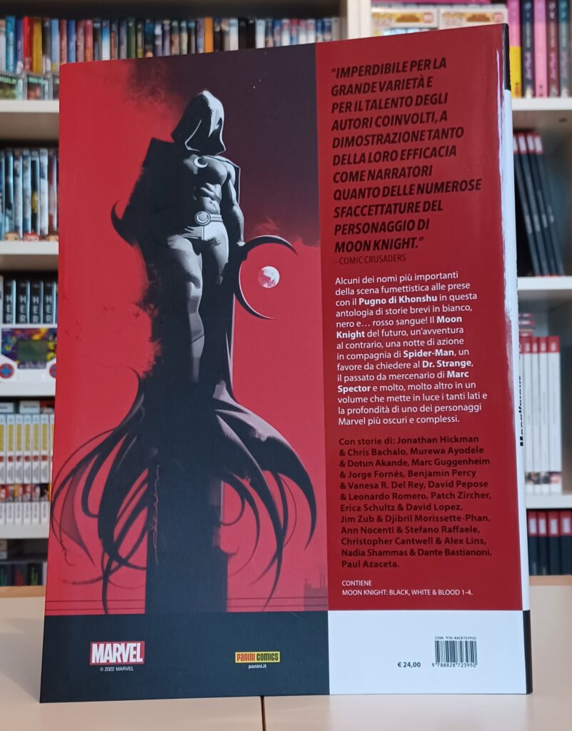 Panini Comics pubblica una nuova, imperdibile antologia in grande formato e in tre colori con protagonista il solo e unico Moon Knight. Tra passato e futuro, tra sanità e follia, una raccolta di storie brevi oniriche e al tempo stesso ricche di azione, nella miglior tradizione del Pugno di Khonshu. In questo volume troviamo un’avventura insieme a Spider-Man, un favore dal Dr. Strange, un incontro tra le varie personalità del Cavaliere Lunare, il Moon Knight del futuro e molto altro ancora, il tutto firmato da un team di fumettisti di prima grandezza, da Jonathan Hickman ad Ann Nocenti, da Gerardo Zaffino a Chris Bachalo, da Stefano Raffaele a Dante Bastianoni.