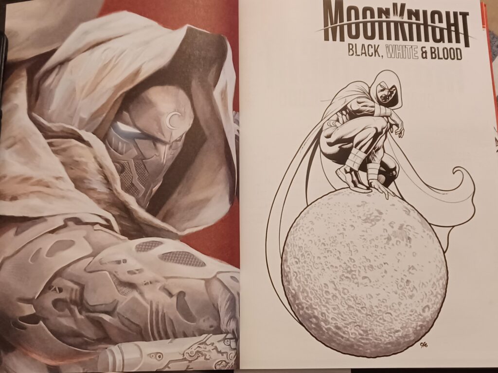 Non stupisce allora che dopo Wolverine, Carnage, Deadpool ed Elektra, la Marvel abbia scelto proprio lui come protagonista di una nuova miniserie della linea editoriale “Black, White & Blood“: composta da quattro numeri, qui raccolta integralmente, contenenti storie brevi scritte e disegnate da tanti bei nomi della scena fumettistica e realizzate affiancando al classico bianco e nero una terza tinta: il rosso, come il sangue versato da coloro che hanno la pessima idea di scontrarsi con Moon Knight. Come è avvenuto nei casi precedenti ogni autore, o team creativo, ha interpretato il personaggio alla propria personalissima maniera, andando a scavare nel suo passato, mostrandocelo in azione oggi e immaginando per lui un ipotetico futuro o tuffandosi all’interno della sua mente, con risultati estremamente divergenti da punto di vita stilistico quanto, invece, uniformemente ottimi a livello qualitativo.