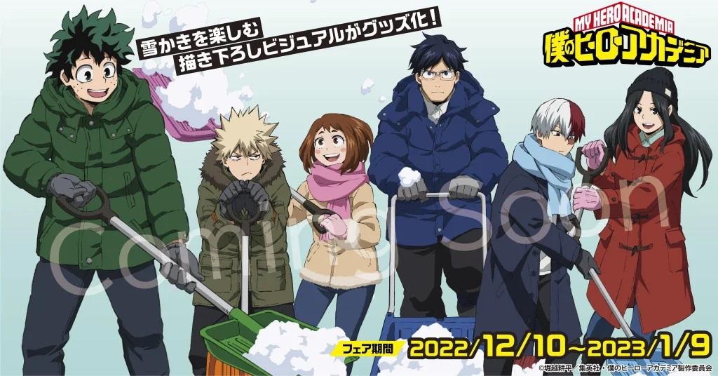Lo Studio Bones e il franchise Shonen hanno pubblicato questa nuova immagine promozionale che mostra personaggi del calibro di Deku, Bakugo, Shoto Todoroki, Uravity, Momo e Iida che si mettono al lavoro per togliere la neve piuttosto che combattere contro le orde malvagie guidate da All For One e Shigaraki: