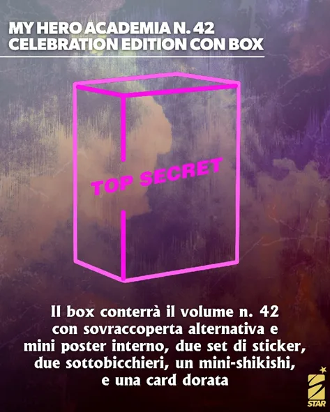 Ma le sorprese non finiscono qui! Per un gran finale degno di questo nome, è prevista anche l’uscita di MY HERO ACADEMIA n. 42 Celebration Edition con box. Un’edizione limitata imperdibile, con una sovraccoperta alternativa e un box da collezione. All’interno, anche una serie di gadget esclusivi: due set di sticker, due sottobicchieri, un mini-shikishi e una card dorata, tutto racchiuso nel box. E non è tutto: il volume sarà dotato anche di un mini-poster interno.