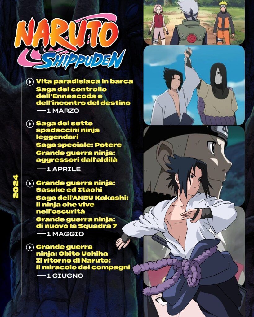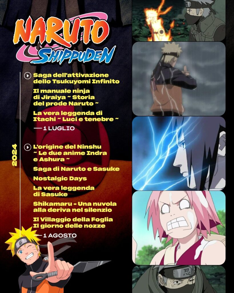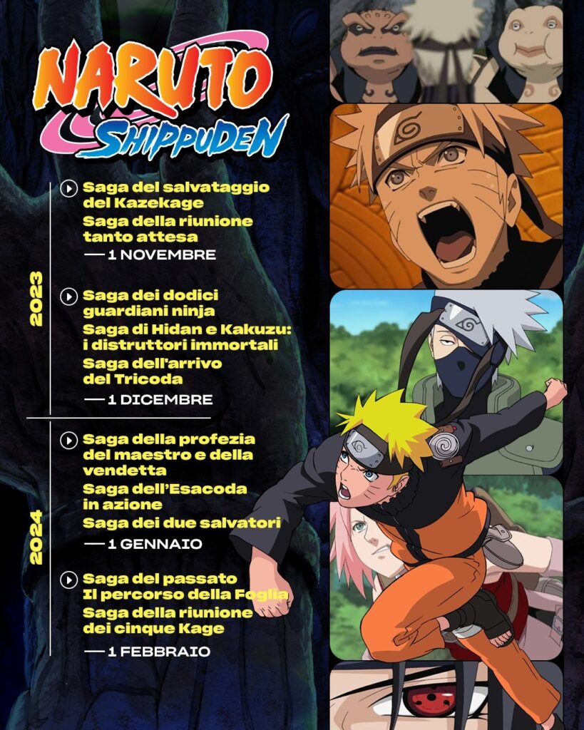 Come vedrete dal calendario a partire da novembre, ogni mese verranno caricate alcune saghe di Naruto Shippuden. Amazon prevede di caricare le ultime saghe ad agosto 2024! Siete pronti a ritornare nel Villaggio della Foglia con il nostro Naruto Uzumaki?