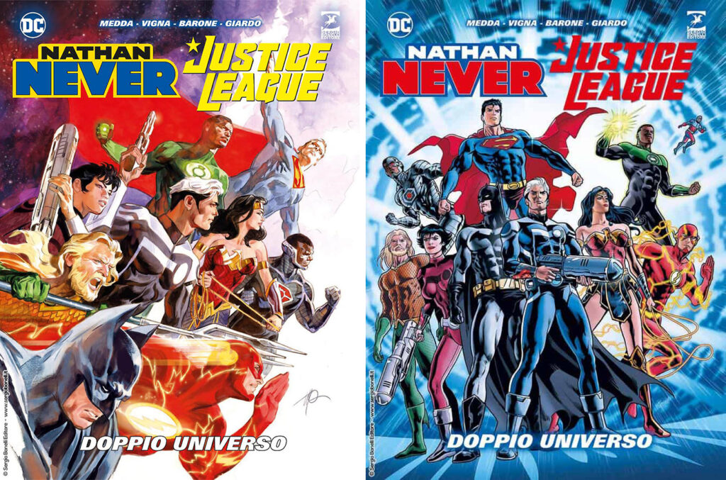 L’Agente Speciale Alfa e i suoi compagni, prima fra tutti Legs Weaver, saranno al fianco di Superman, Wonder Woman, Batman, Aquaman e tutti gli altri eroi più potenti della Terra, per combattere una terribile minaccia per il Pianeta e l’intero universo. La lunga avventura di NATHAN NEVER – JUSTICE LEAGUE. DOPPIO UNIVERSO non racconta solo una drammatica battaglia tra il bene e il male, ma è anche l’incontro di diversi caratteri, di differenti idee di giustizia, di esseri umani e esseri quasi divini che dovranno trovare un equilibrio per raggiungere l’obiettivo finale.